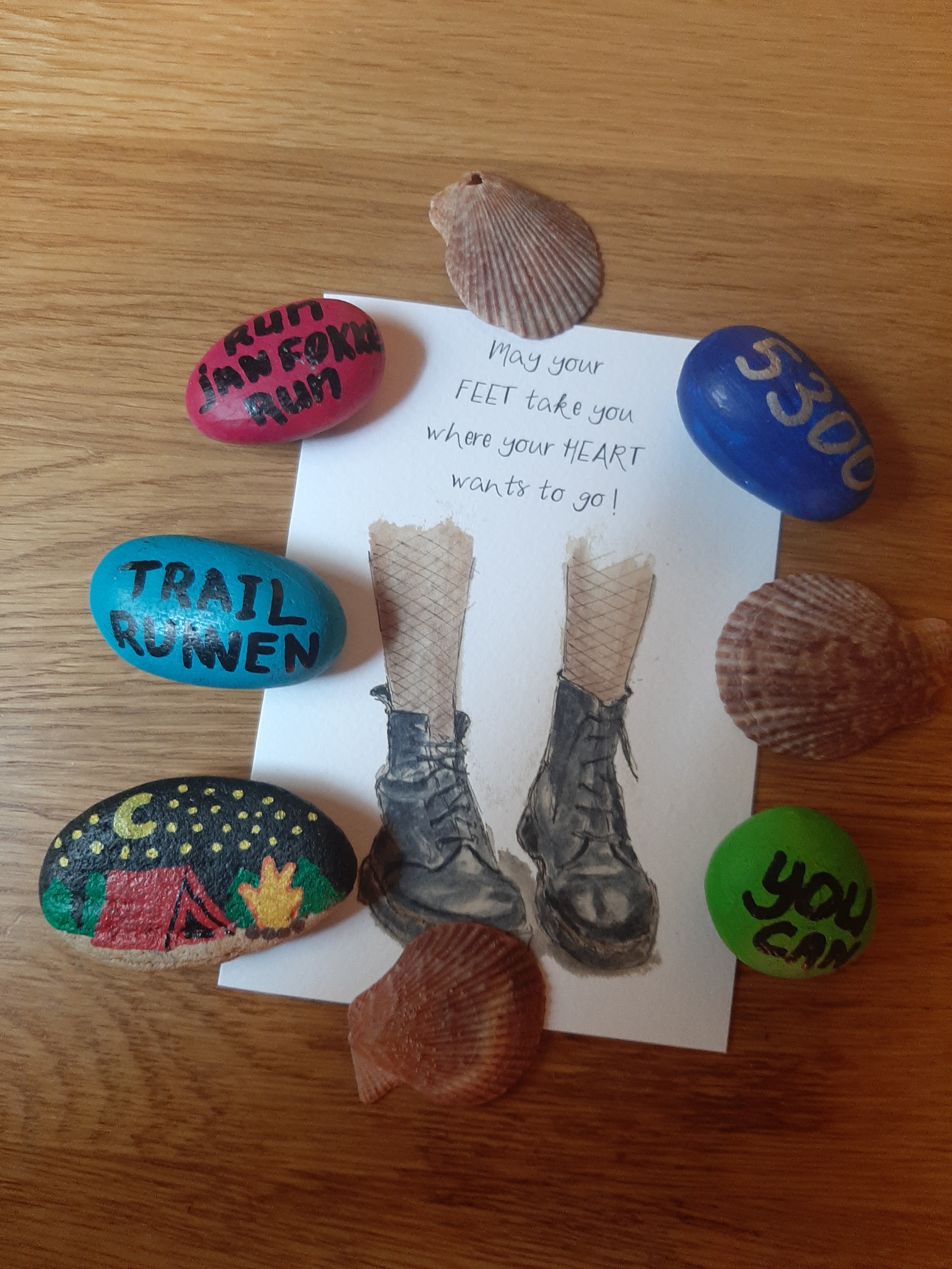 Twee Trailrunnen.nl-buffs worden in mijn handen geduwd met de blije snufferds van Cor en Geraldine erop, evenals een paar superlichte armstukken, functionele presentjes die direct aan de uitrusting worden toegevoegd. Daarnaast hebben beide een handvol inspiratiekaartjes gegeven voor de slechte momenten of om op het pad weg te geven aan mensen die inspiratie nodig hebben. Een leren veter met 20 geplastificeerde kaartjes.