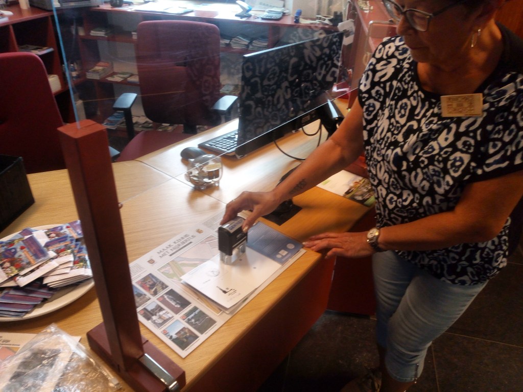 In de kerk zoek ik een stempel. Alles potdicht, maar ik mag de toren beklimmen. Dat laat deze pelgrim even… 100 meter verder het VVV. Twee bejaarde dames aan de koffie. Als ik vraag om een pelgrimsstempel raak ik een snaar. Kordaat beent de ene weg op zoek naar een stempel van de gemeente Gennep. Yes! Mijn tweede stempel.