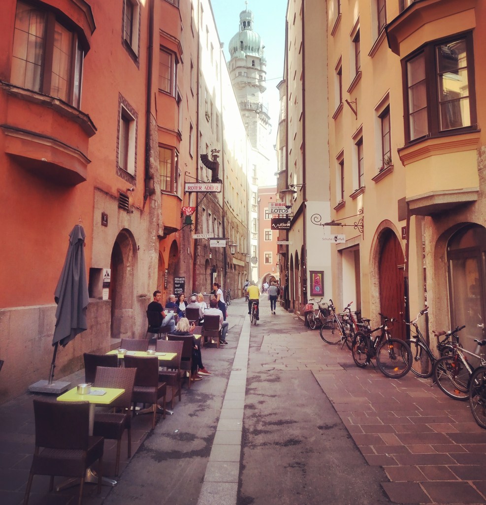 Bij de kerk waar ik gisteren op het terras zat, blijken ze een mooie stempel te hebben voor mijn pelgrimspaspoort, in rood staat er nu Innsbruck in. De dame in kwestie feliciteert met het pelgrim zijn. Zelf heeft ze gisterenavond de zeven gelopen met haar drie dochters.