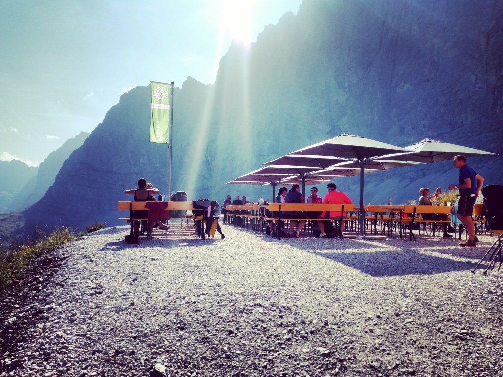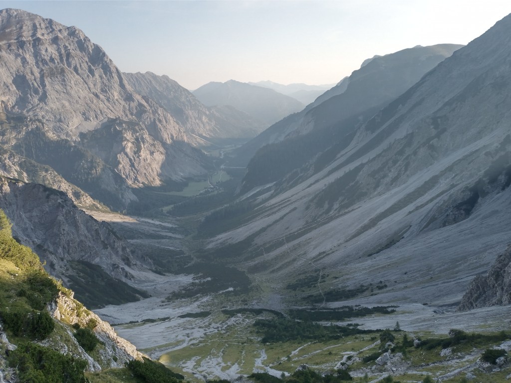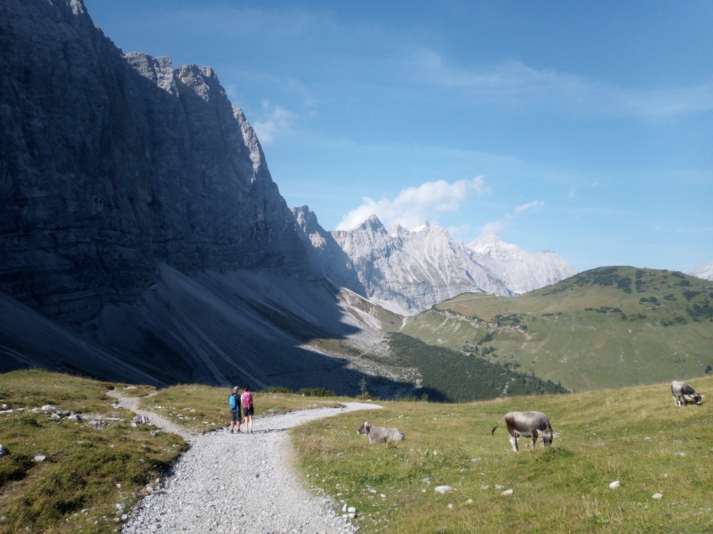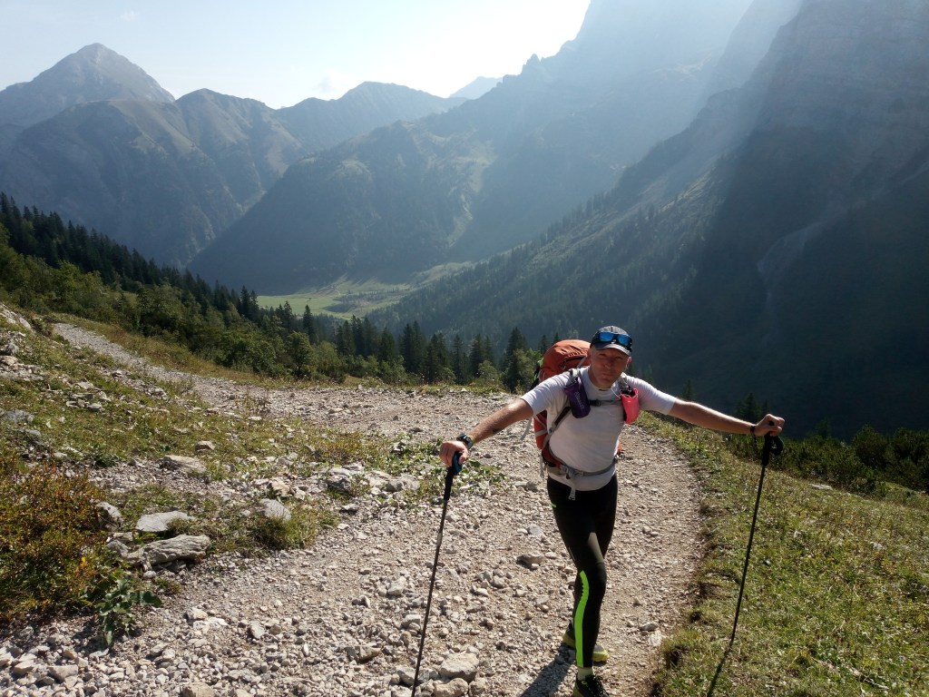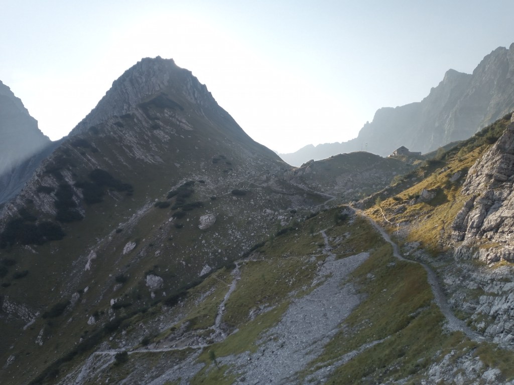Ik jank de helling af en haal iedereen in die de hut voor me heeft verlaten – ik blijf een avondpelgrim ook al vertrek ik om acht uur. De afdaling loopt heerlijk en voor ik het weet zit ik in een heel ander dal en alweer in de klim naar de Falkenhutte.