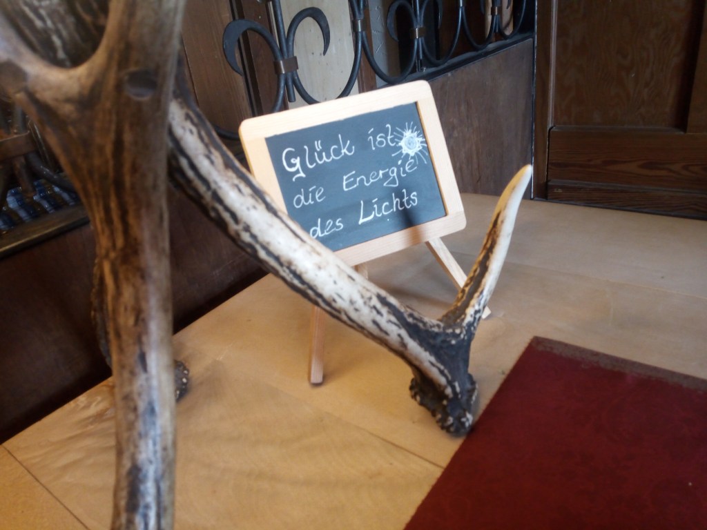 Bij het opstaan de geur van gebakken eieren met spek die via het trappenhuis het kamertje inkringelt. Slaperig op slippers naar beneden. Dit is misschien wel een van de grootste geluksmomenten in het leven. De kachel hoog gestookt, je verkeert nog in een halfslaap. Zacht gemurmel van mensen op de achtergrond terwijl je jus drinkt, koffie geniet en een krant bestudeert en uitpluist. Een veilige, warme cocon die je nog even hoedt, voor de hectiek van de dag begint. Liefst zou je deze momenten oprekken tot dagen. Zachtjes een muziekje op de achtergrond maar zo zacht dat je de individuele nummers er nauwelijks uit kan pikken, in dit geval in gemutlich Deutsch. Duitsers zijn hier genie in; geblokt kleedje, eitje, mooie bolletjes en een bordje op mijn tafel: Gluck ist die Energie des Lichts. Laat de dag maar komen, of nee laat ik het moment langer koesteren…