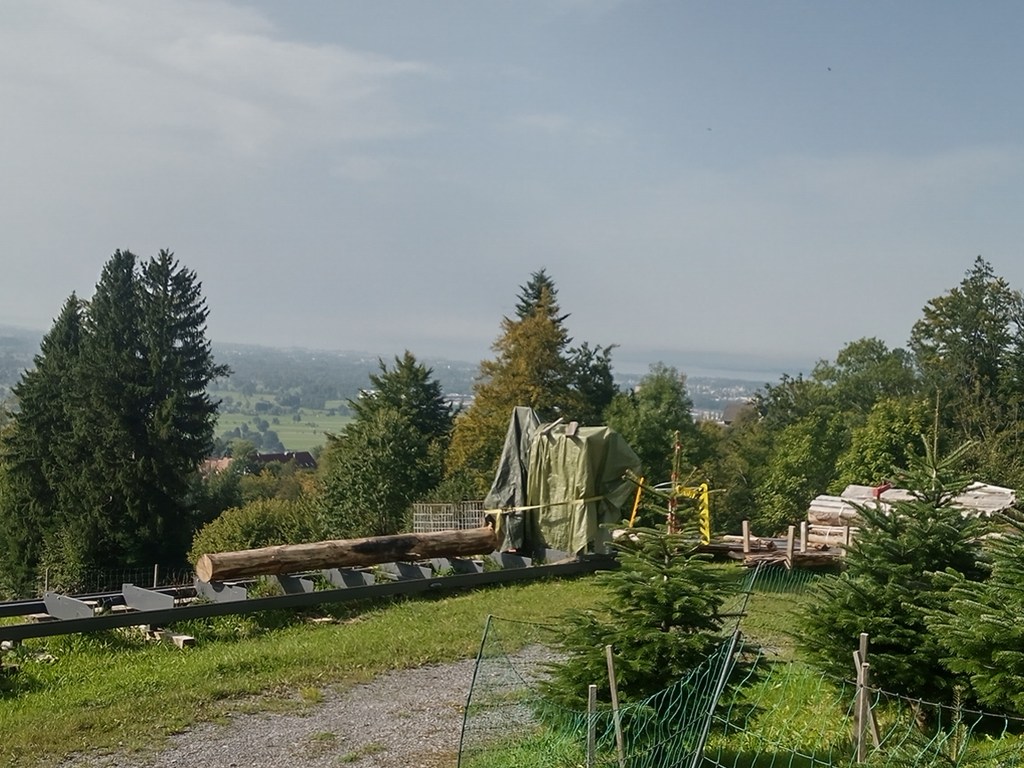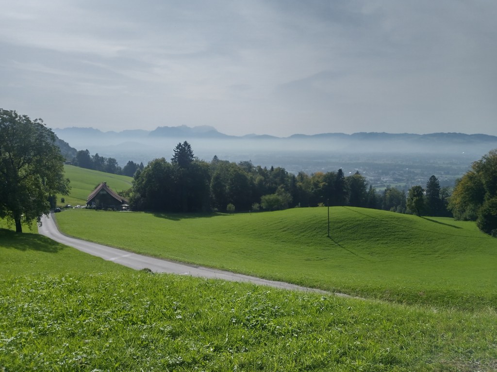 Via een hooggelegen plateau steek ik door waarna een vallei zich opent. Beneden ligt Dornbirn met daarboven een indrukwekkende laag smog. Rechts aan de einder de Bodensee. Achter Dornbirn Zwitserland en Liechtenstein.