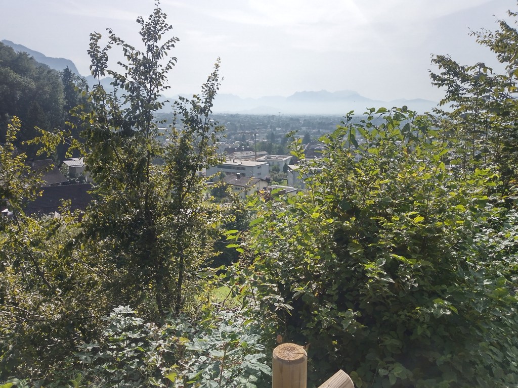 Afijn, mijn tijd tikt door en weer ben ik geen vroege vogel. De weg voert van de camping langs een drukke weg richting Liechtenstein. Daar waar mogelijk wijk ik af en volg de hogergelegen voetpaden op de berg. Het is verschrikkelijk benauwd en zweten is het devies. Na een uur moet ik stoppen om mijn tepels af te plakken. Bewegende delen schuren kapot.
