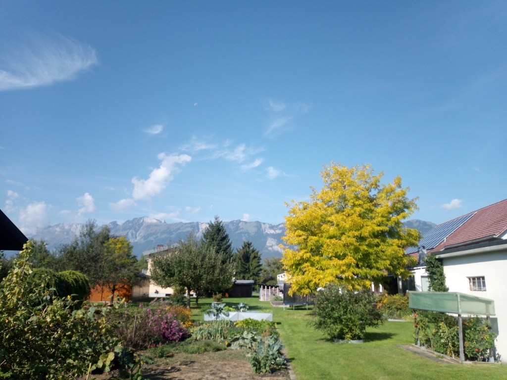 Lachend ren ik naar Liechtenstein. In het dorp eerst nog een enveloppe met knipsels die ik verwerkt heb voor mijn boek, op de post.