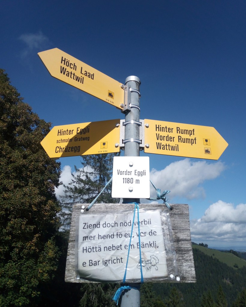 Op het tweede topje de hut van de buurman. Een A4 in uiterst technisch Zwitsers vraagt al mijn talenkennis en doet vermoeden dat er een ‘bar’ is naast het bankje. Inderdaad vind ik een lade die ik uit de hut kan trekken met daarin ijskoude drankjes. Voor twee Franken mag je je voltanken.