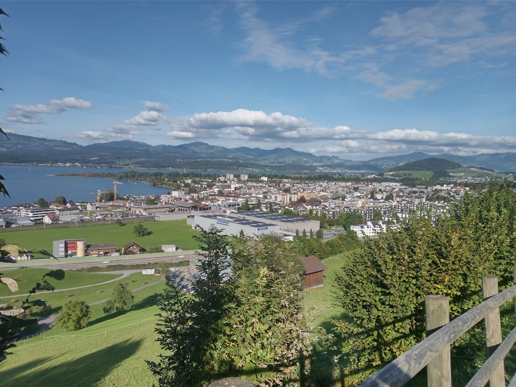 Het uitzicht over de Zurichsee is prachtig, een strak blauw meer – door de blauwalgen waarschijnlijk – met daarachter groene almen, 1 miljard koeien en dito bellen. Al met al zoals je Zwitserland op je netvlies hebt.