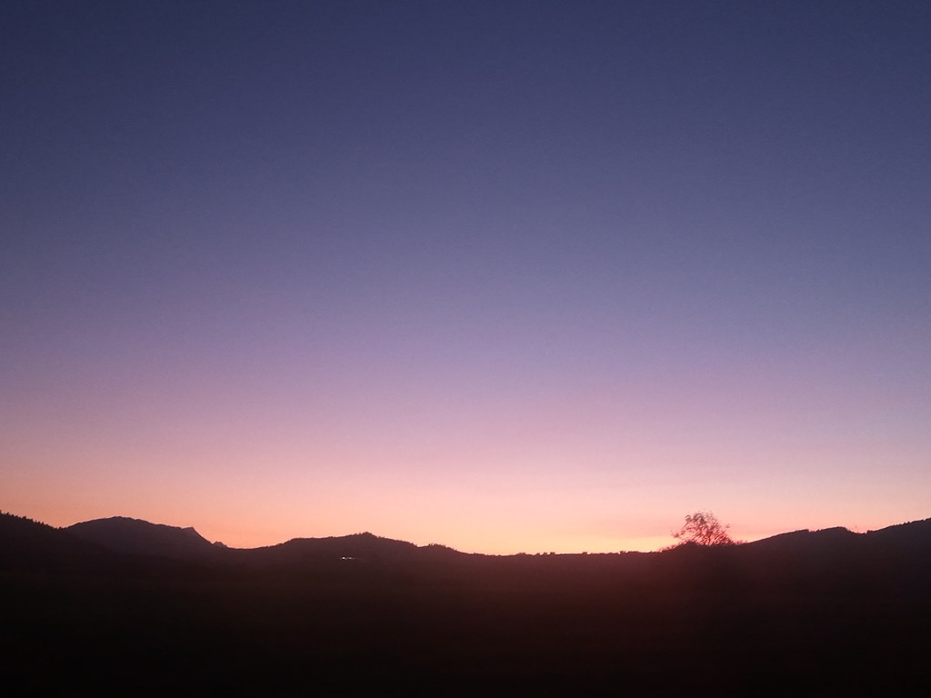Natte kleding op een van de banken, matje erop, ik erop en drogen maar. De zon zakt achter de bergen en laat laveldelkleurige tinten in de lucht achter. Spectaculair. Morgen weer zo’n dag…