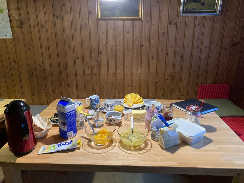 Het ontbijt is een tafeltje dekje-ervaring van ongekende weelde; yoghurt, jus, koffie, thee, verse jam, Zwitserse kaas, tomaat, komkommer, halve perzikken, annanasschijven, oerbrood. Waarom ga ik hier nog weg?