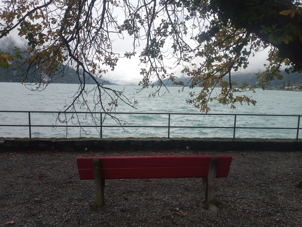 Ik heb geen enkel stof. Voor het eerst is het herfstweer. Een koude wind waait over de Brienzersee en doet schuimkoppen opwaaien. Meteen fladderen bladeren langs mij gezicht en doet de Indian Summer nog iets beter haar best zich te tonen. Ik word er blij van en loop uren te neuriën met de iPod aan.