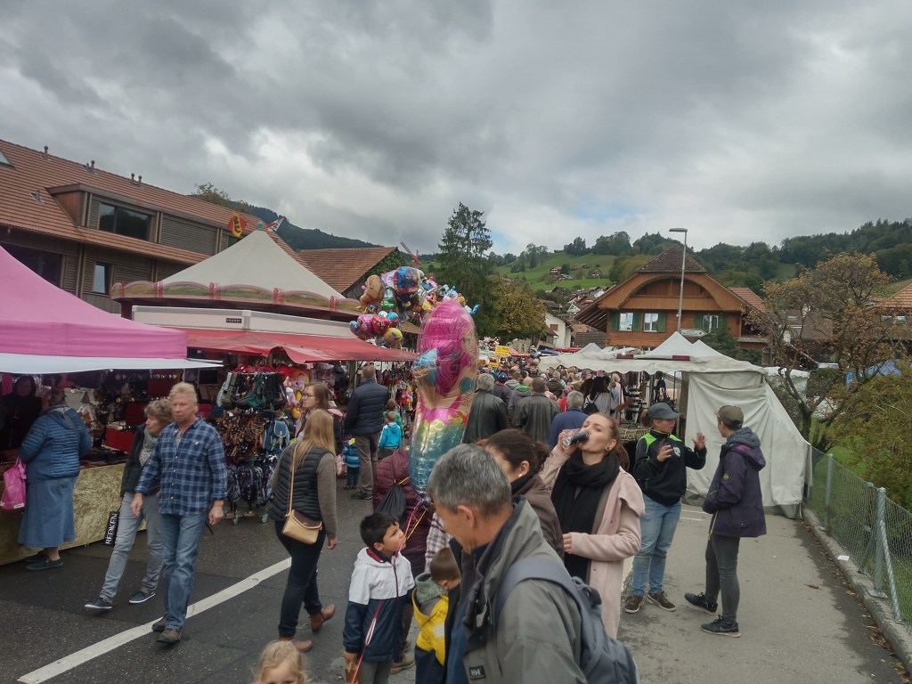 Smikkelend aan een broodje mozzarella tomaat door. Wattenwil is inderdaad een klein dorp met een mensenmassa. Inhalen van een markt die er vorig jaar niet was door Corona. Tientallen standjes met hapjes, armbandjes, kleding, tamme kastanjes en andere fijne geurende dingen. Ik trek door de menigte en haal boven in het dorp mijn stempel. En doorrr…