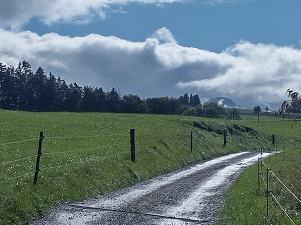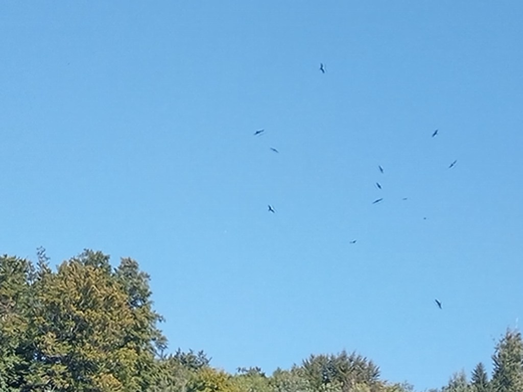 Dit is inmiddels natuurpark Gantrisch. Niet heel spectaculair maar mooi glooiend. De hagelwolken hangen dreigend en veroorzaken fel licht dat glinstert in de plassen. Voortdurend cirkelen tientallen grote roofvogels boven mijn hoofd. Het doet wat apocalyptisch aan, een feeding frenzy…
