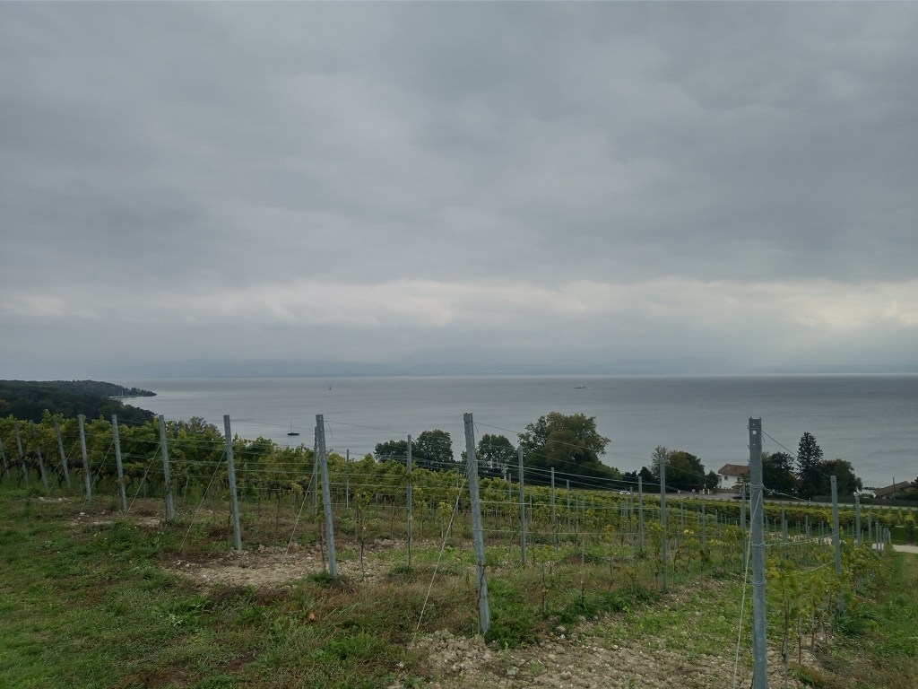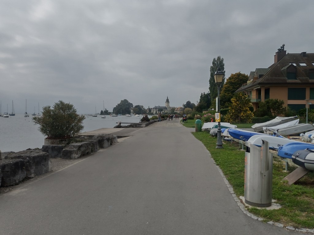 Zin in deze etappe, een beetje meanderen langs de oevers van het meer van Geneve. Dat vond ik ook altijd het leukste aan NS-wandelingen, dat je op de rand van civilisatie loopt. Dat een groen pad zich tussen beschaving en natuur door een weg baant. Ik las ooit in de Optimist dat in de natuur deze plekken het levendigste zijn; natuur floreert in de rafelranden.