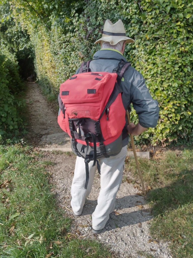 De route voert wederom langs het meer en voert van het ene naar het andere gehucht. Ergens in het groen een kerel voor me. De klassieke pelgrim; wandelstok, hoed, Jacobsschelp aan de rugzak en knokige knieën. Hij hoort me aankomen en wacht. Een leuk gesprek. Hij heet André, voor Andreas, zoals later blijkt uit zijn visitekaartje. Een Duitser die getrouwd was met een Belgische dus hij spreekt een paar woorden Nederlands. Mijn vierde pelgrim en we eindigen onze ontmoeting met foto’s van elkaar schieten, eens iets anders dan en pelgrimselfie.