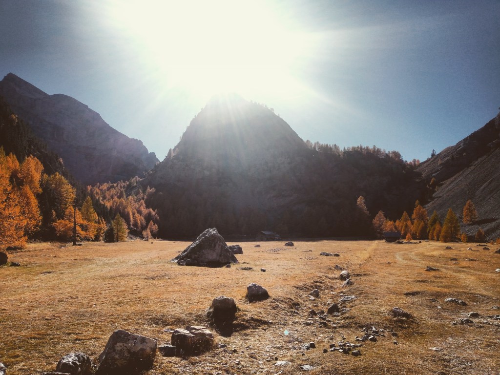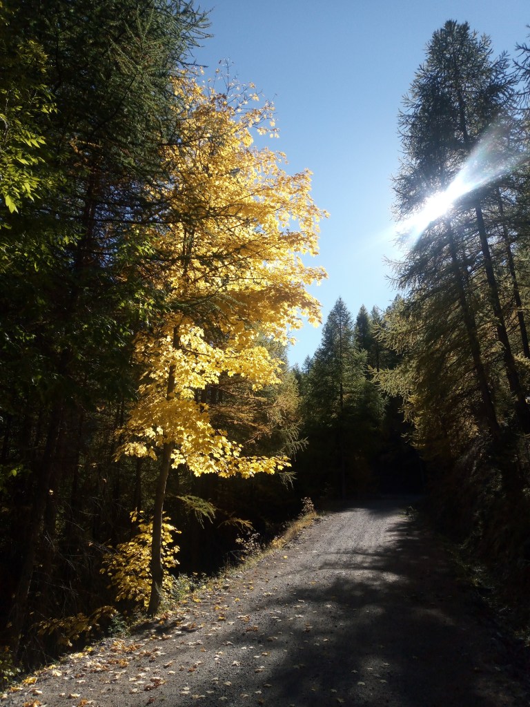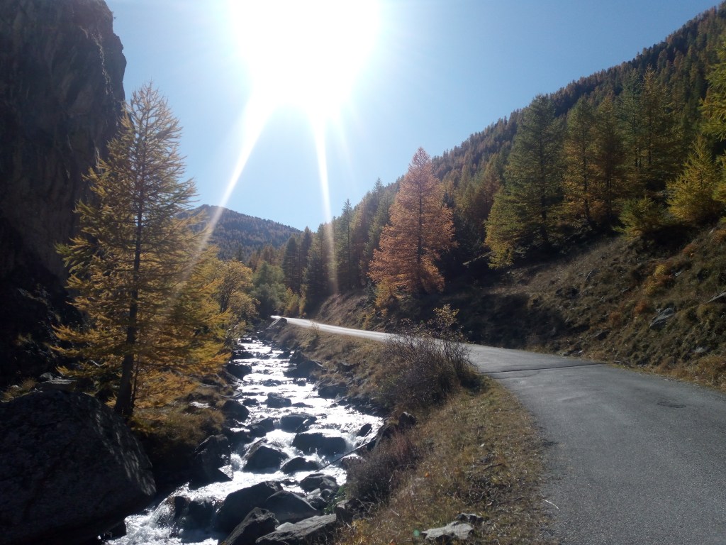 Na een aantal kilometers door Briancon voert een gravelweg me links omhoog de Vallee des Ayes in. Via een okergeel dennenbos werk ik me honderden meters omhoog als door een felgele tunnel waar niet alleen licht aan het einde gloort, maar overal eigenlijk.
