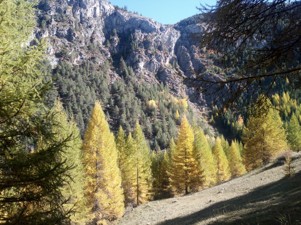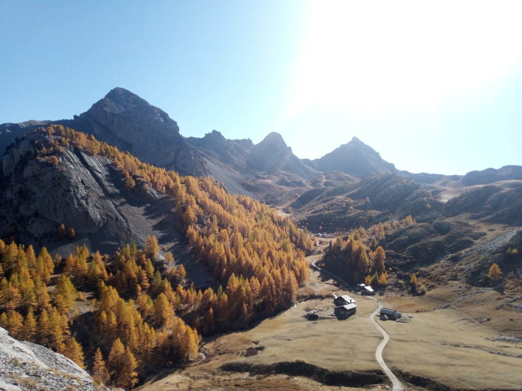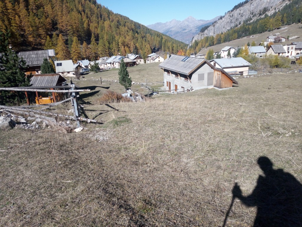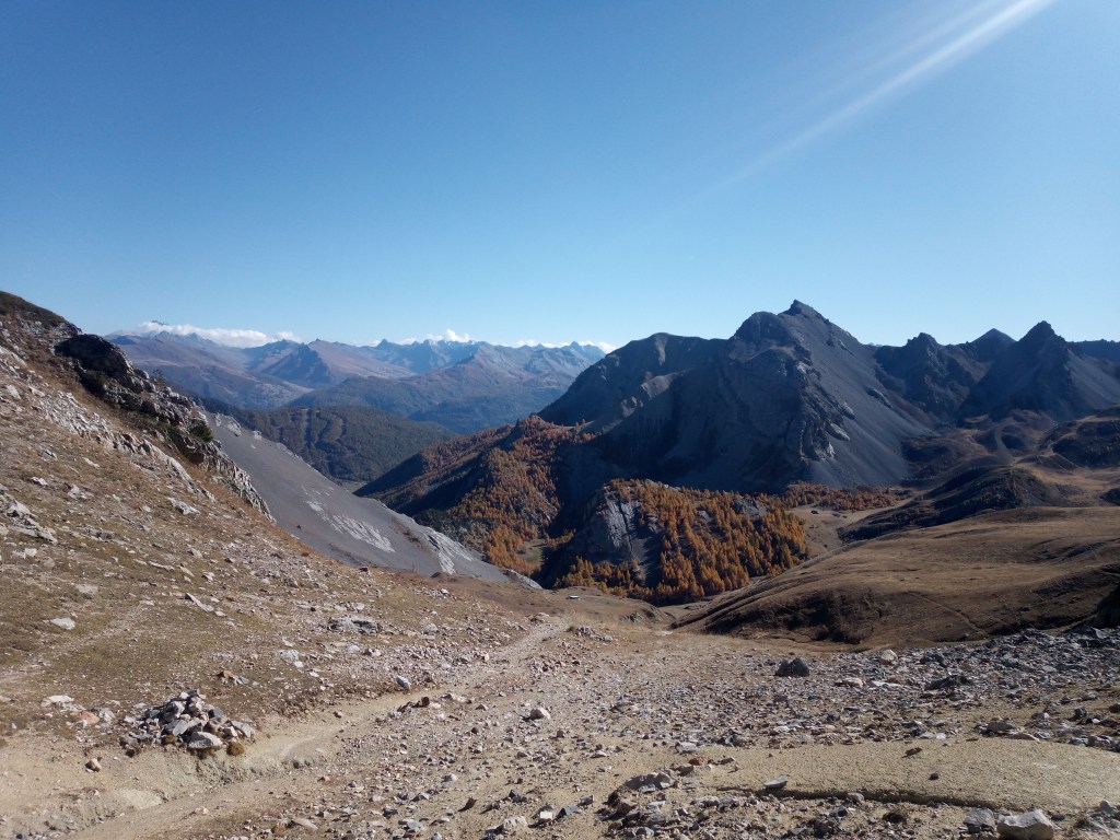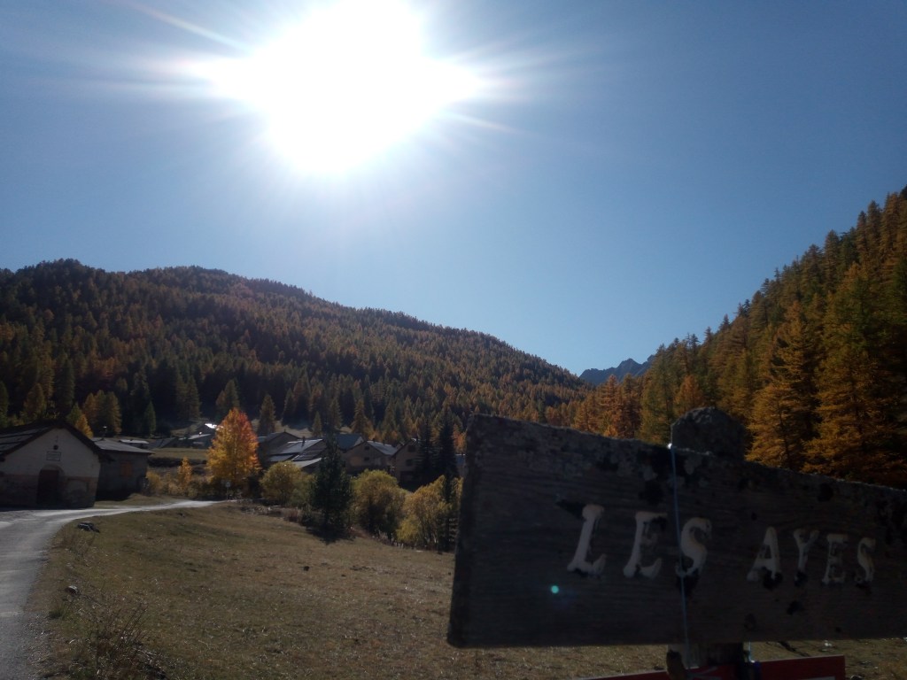 Ik moet in het durp linksaf en de gravelweg verlaten voor een geitenpad naar de col des Ayes. Op de kruising hoor ik Nederlands spreken, pas voor de tweede keer in bijna 70 dagen. Ik raak in gesprek met een aimabel stel, hij Nederlands, zij Frans maar Nederlands sprekend uit Embrun, iets verder naar het zuiden. Gezamenlijke euforie over de waanzinnige herfstkleuren, de strakblauwe hemel en het adembenemende gebied. Ze zijn hier elke dag buiten om te struinen. Ze gaan via het meer verderop in de kom omhoog, misschien treffen we elkaar nog op de kam. Een leuke ontmoeting.
