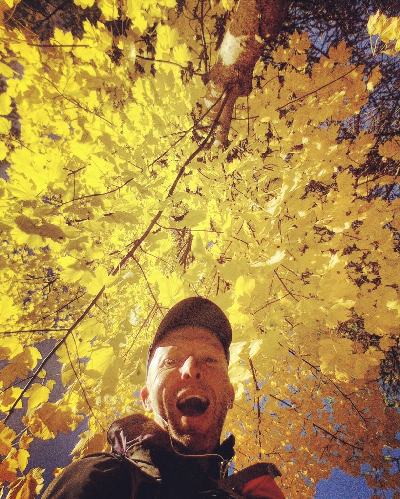 Ruim tien minuten later ben ik honderden meters afgedaald. Test geslaagd. Euforisch gillend ren ik door een arena van herfstkleuren, een klein spiegelglad meer dat de gele sparren weerspiegelt en even verder een vallei met alleen maar groene en gele sparren. Als er een God is en hij creëerde een hof van Eden waarin hij Adam en Eva plaatste, dan was het hier.