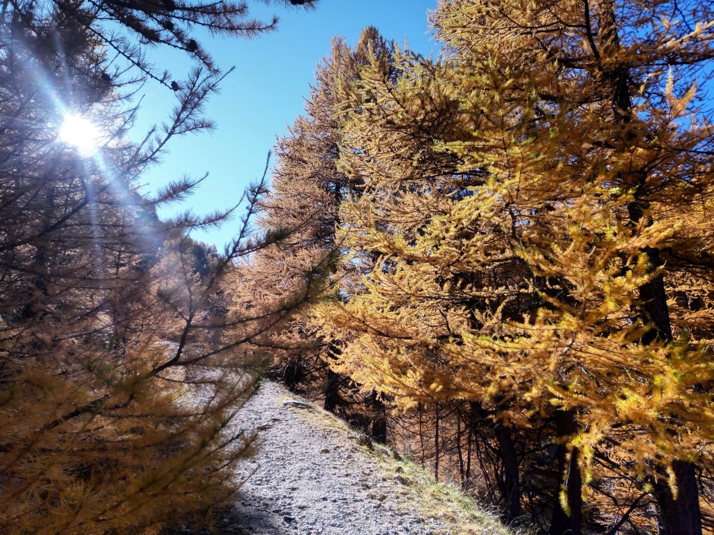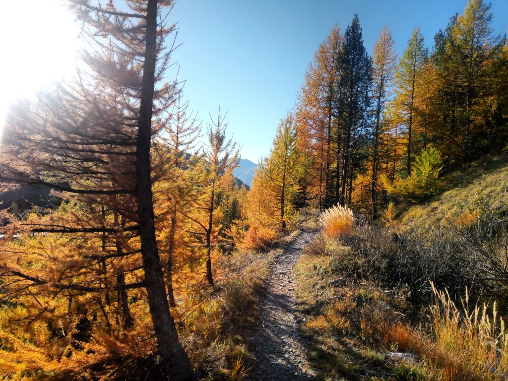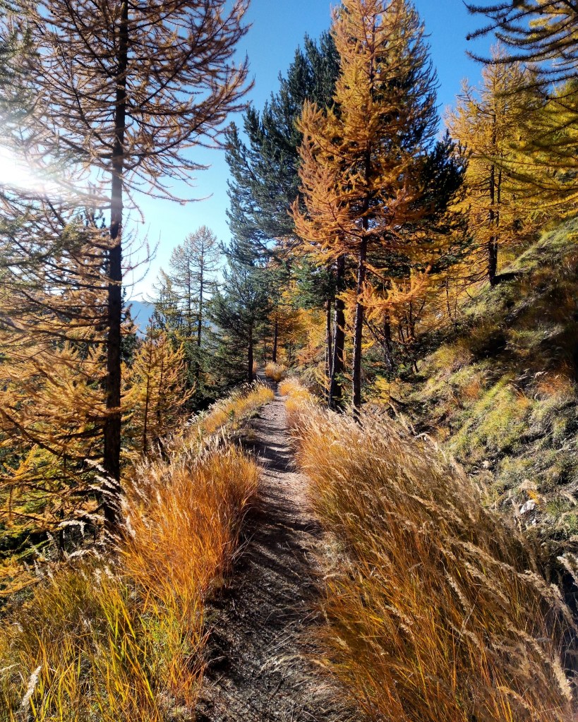 De route voert een stuk naar beneden via de weg en dan rechts de flanken van de berg op richting de Col de Furfande op 2.500 meter. Een prachtige klim door geelgekleurde dennenbossen met op de bodem geelgekleurde gras. Vandaag is geel.