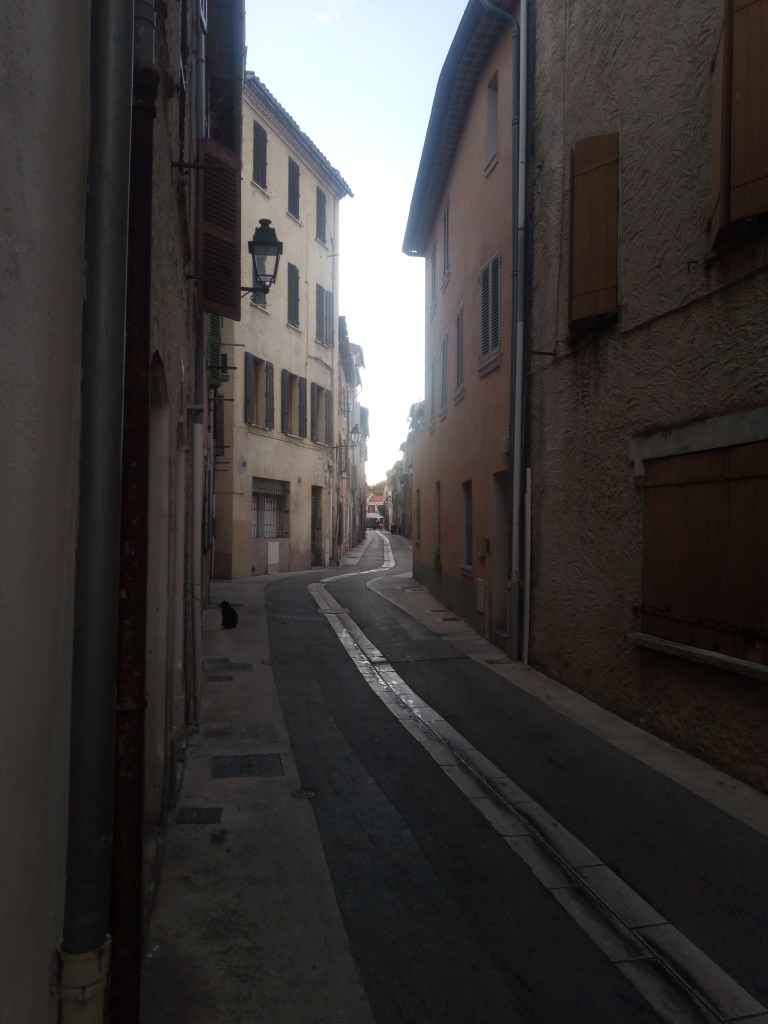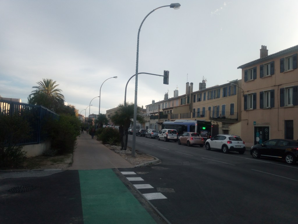 Vandaag een korte wandeling op het programma naar het gat La Seyne sur Mer. Ik heb er zin in want volgens de kaart loop ik om havengebied en dus bootjes. Daar verkijk ik me ernstig. Dit is een militaire haven en dus hoge muren met prikkeldraad de hele weg. Ik zie exact nul boten en of water.