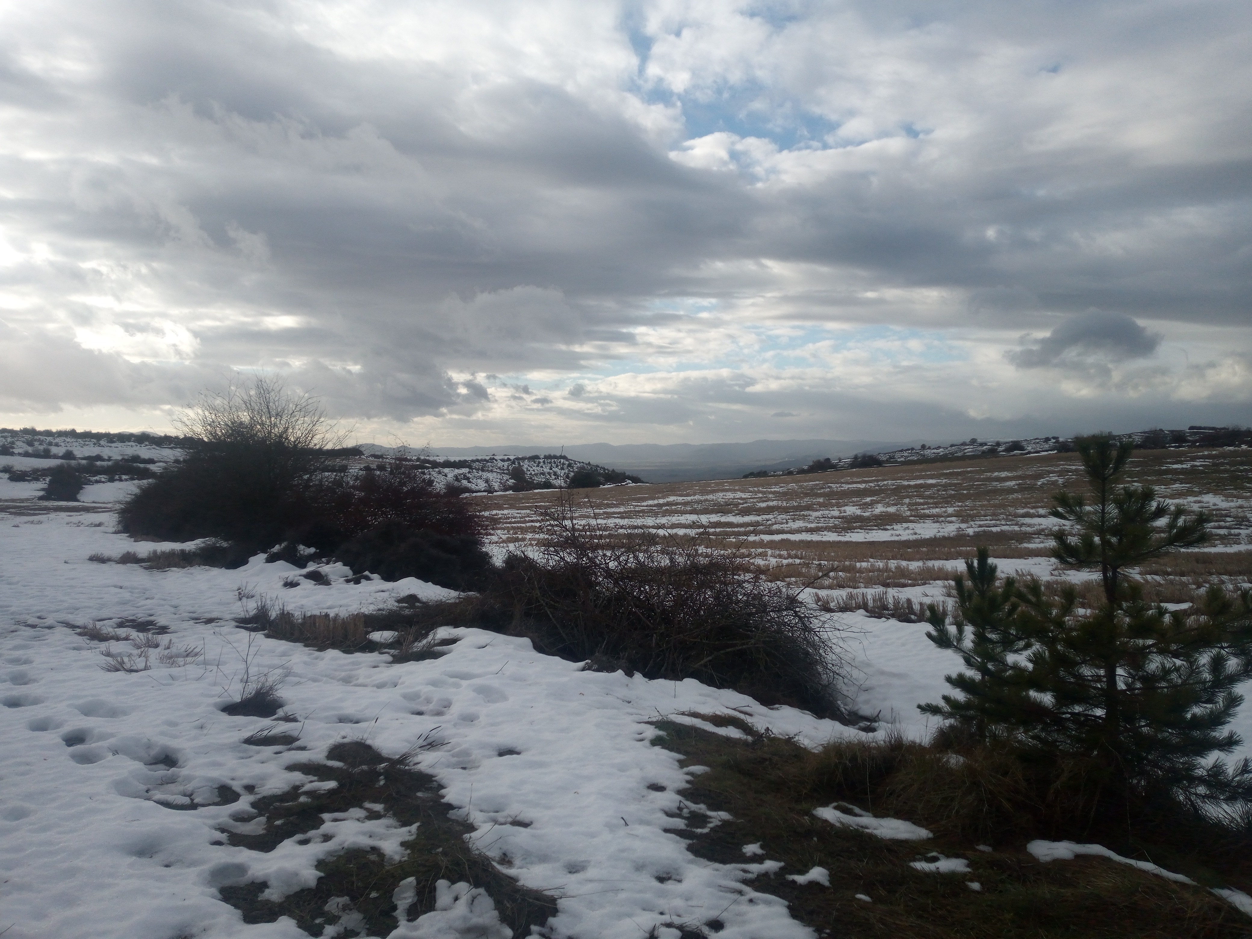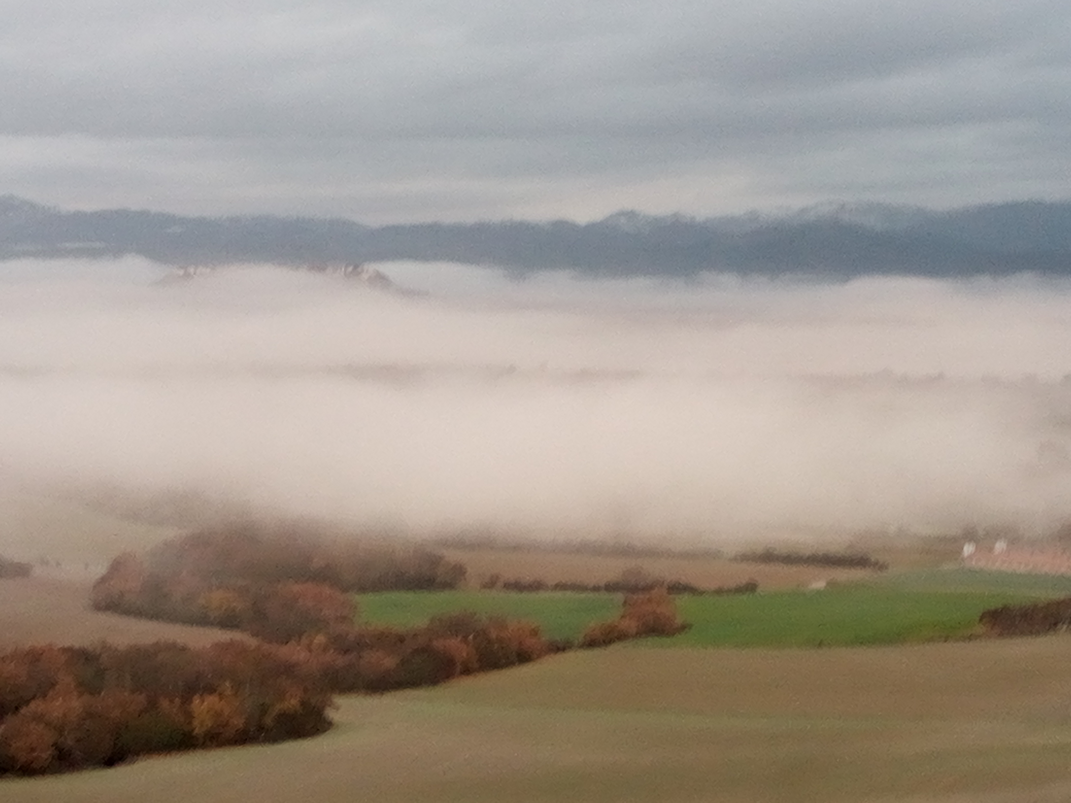 De dag begint fantastisch. Om half acht is het net licht en alle dalen zijn volgelopen met zware koude lucht, inversie, en daar mag je op neerkijken. Prachtig hoe hard de randen zijn, iets zit er wel onder, of niet, geen middenweg. Het is doodstil en een plezier om even te staan.