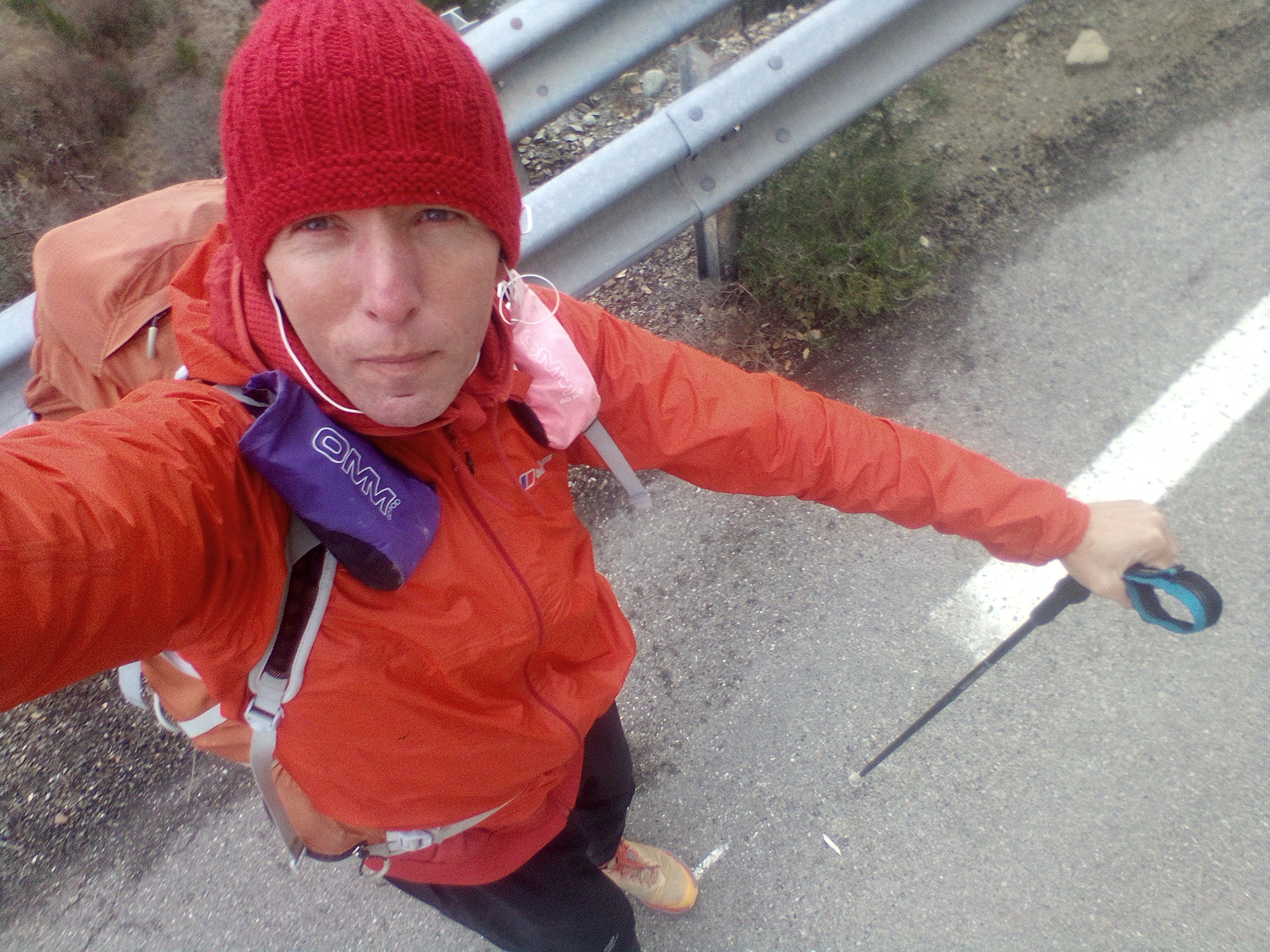 Wederom een Baskisch stel dat me zes kilometer meeneemt naar Yebra de Basa, een klein dorp middenin de sneeuw langs de weg. De oprit leent zich uitstekend voor de duim en lijkt een prima spot. Toch sta ik er een uur later nog en het loopt al tegen drieën. Moedeloos word ik langzaam. Wanhopen helpt echter niet, het is de wet van de aantrekkingskracht. Blijf positief lachen en je wordt meegenomen.