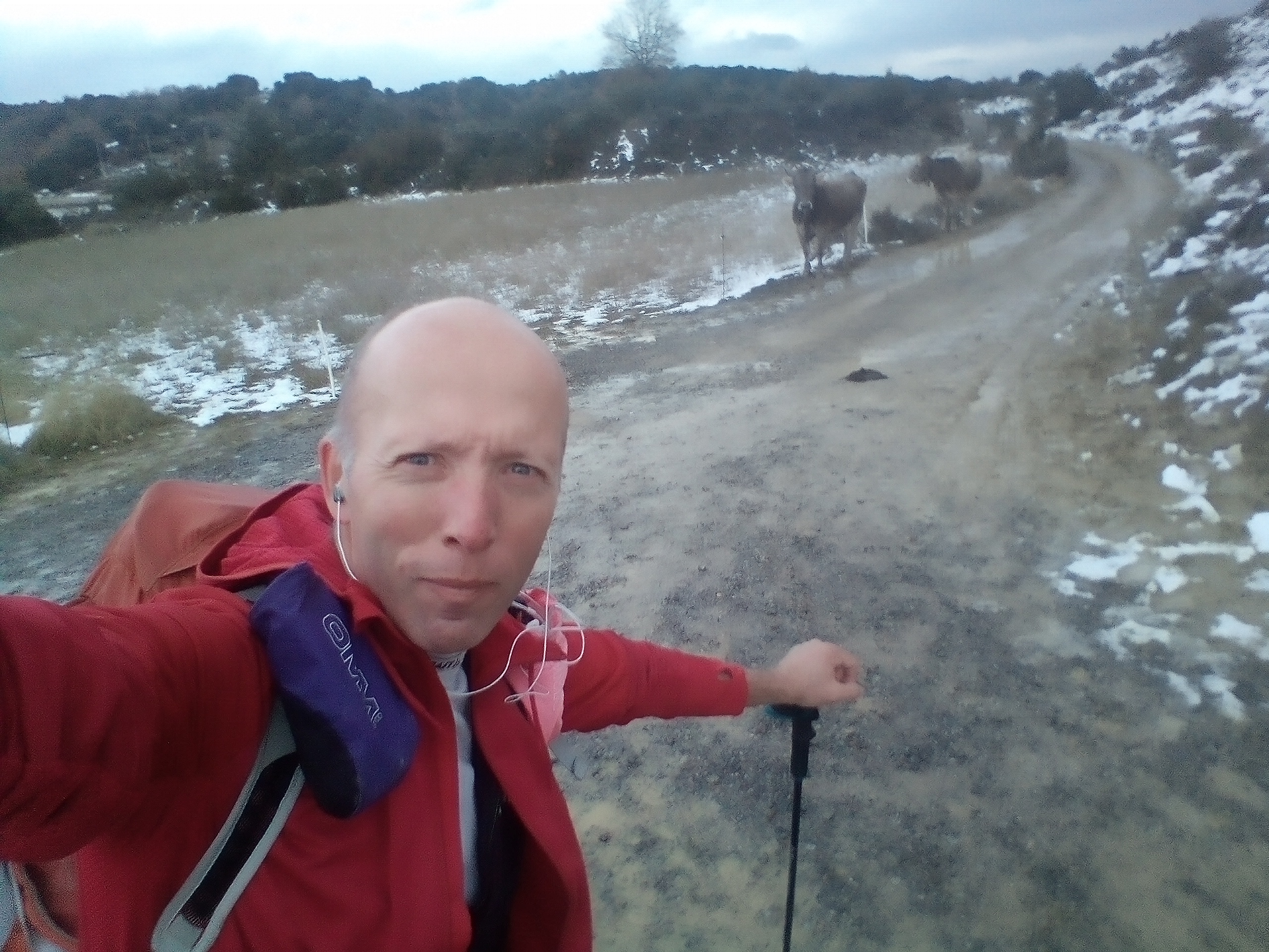 Ik heb de duim nog niet omhoog of een dynamische dame stopt met gierende banden. Ze gaat naar een camping in Sabinanigo om met vrienden vuur te maken en wijn te drinken. Het ligt precies op mijn route dus zeker veertig kilometer kletsen we in het Engels. Ondertussen wordt de wereld langzaam wit. Rondom Jaca is zeker dertig centimeter verse sneeuw gevallen en er wordt wat afgewandeld en gelanglaufd, een Anton Pieck-landschapje.