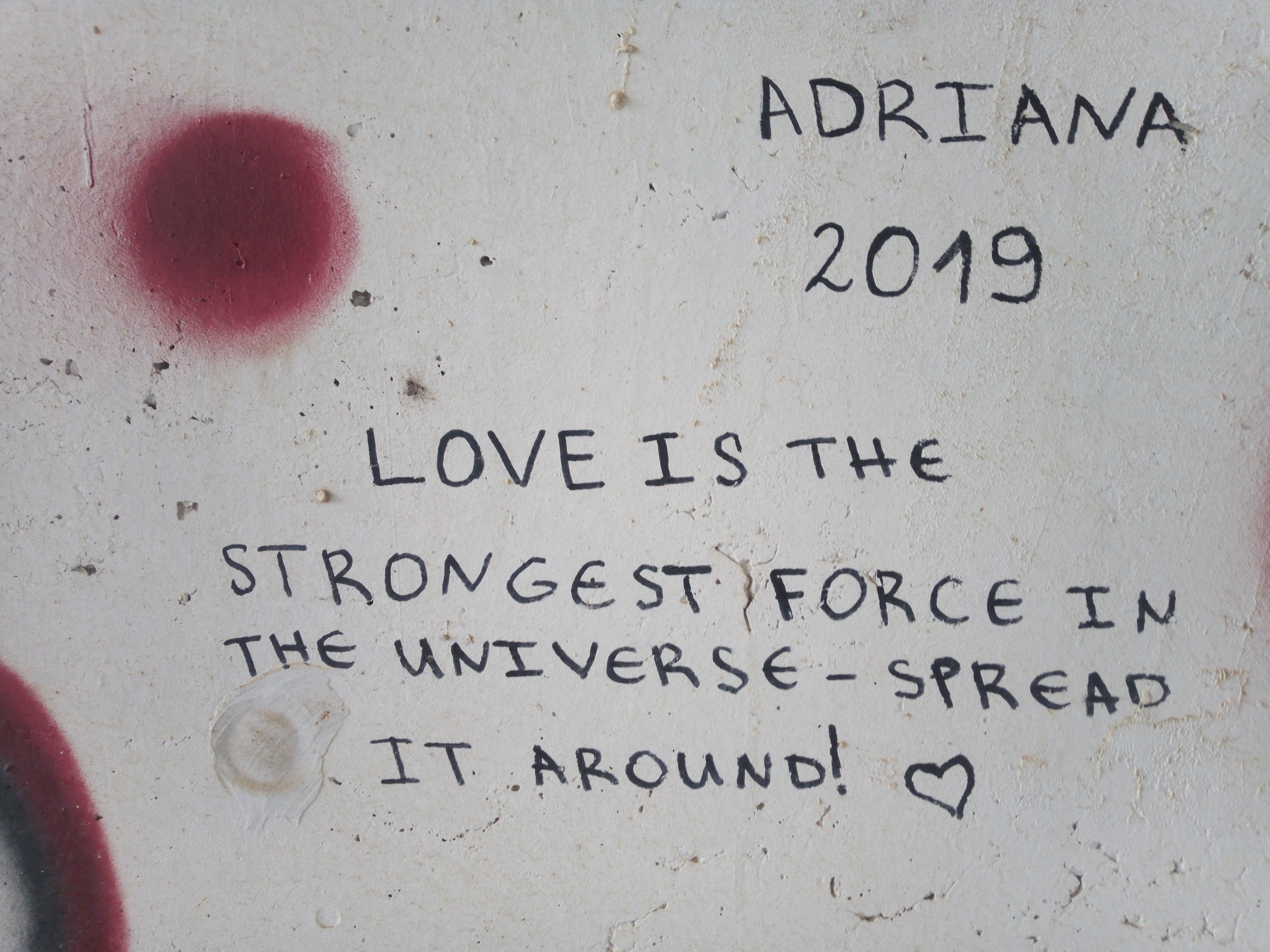 Hij bestelt vino tinto en we krijgen een bak noten aangeboden van bekkie. Italiaan eet noten en spoelt ze haastig weg met de rode vloeistof. Hij ademt levensenergie; het is een verademing in zijn buurt te zijn. De nootresten spatten rond als hij met stem en handen in Italiaans Engels met ons communiceert. We laven ons aan hem.