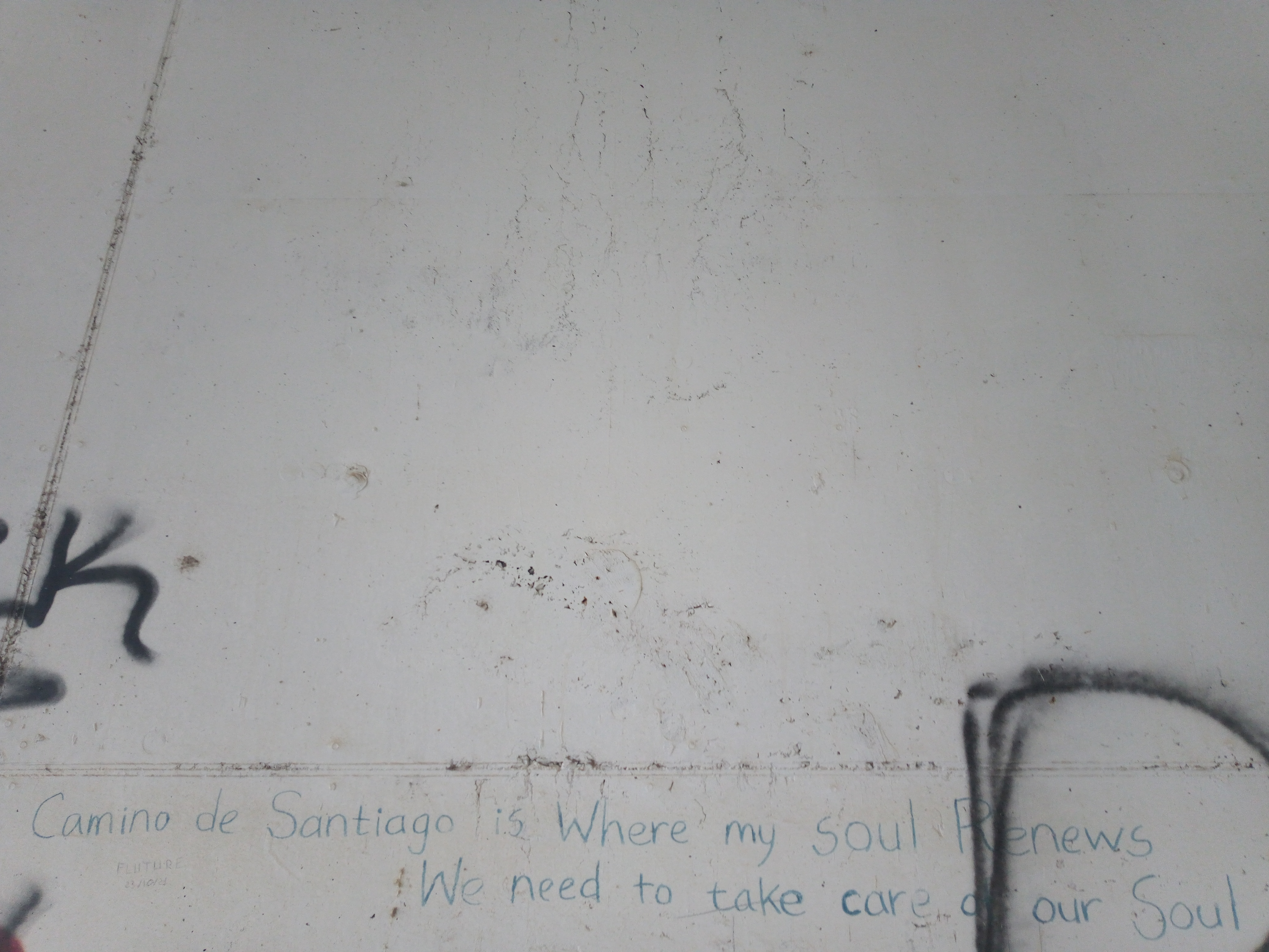 Fabio deelt met ons zijn caminoverhaal. Vier keer eerder liep hij hem. Eenmaal werd hij vier dagen achtervolgd dooreen condor, een gigantisch apparaat. De vierde dag vloog de vogel over hem met flapperende vleugels die in de wind riepen ‘papa, papa, papa!’ Terwijl Fabio het vertelt heeft hij de ogen van een klein kind dat in trance is, totaal overtuigd en terug in de beleving. Ieder heeft zijn Caminoverhaal.