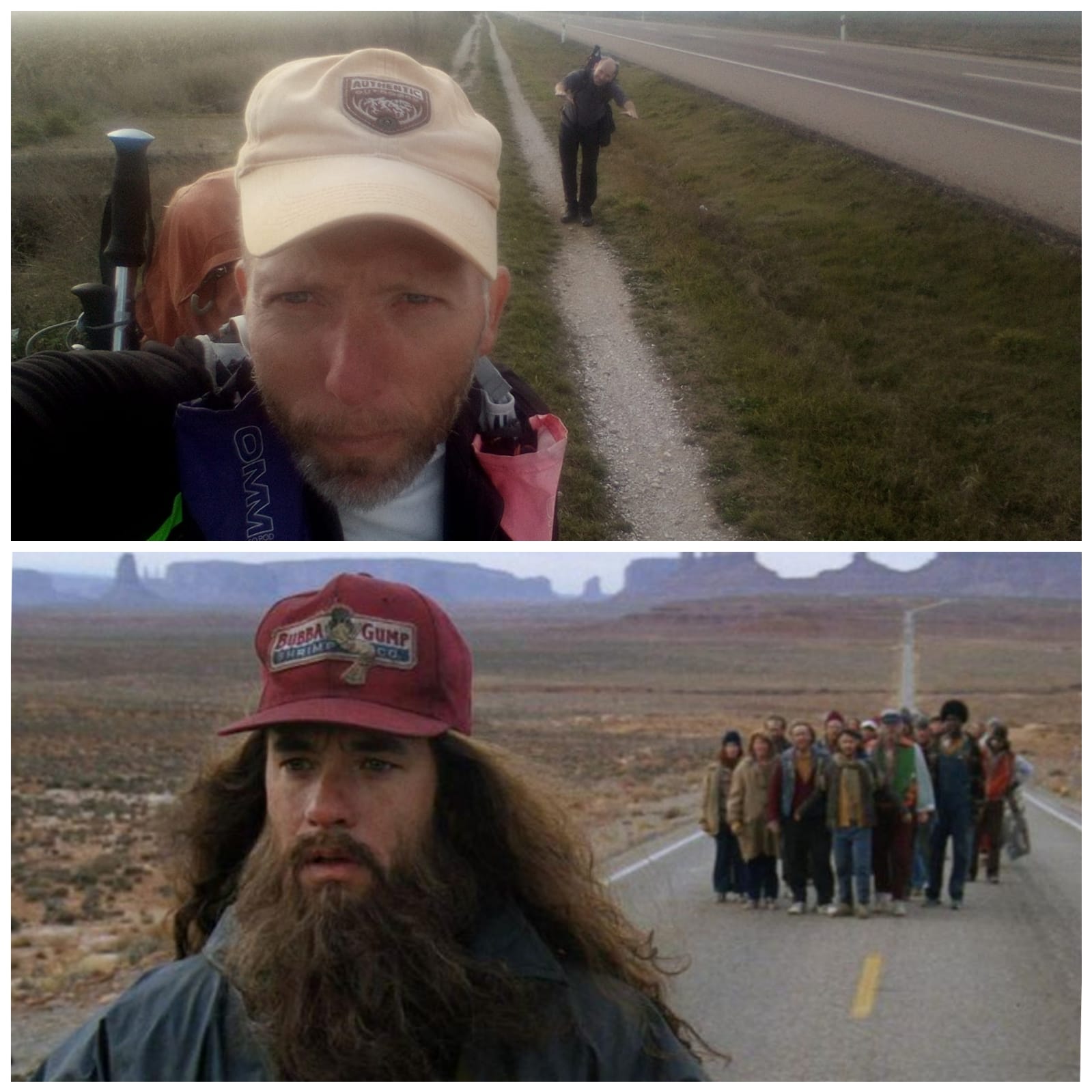 Met het uur naderen we zichtbaar de bergketen die voor ons ligt. Steeds gretiger trekken we voort. Marcel krijgt van zijn neefje een foto van Forest Gump die rent in een gelijksoortig gebied met achter zich zijn schare volgers. We imiteren de foto, ik het petje van Marcel op, Marcel als buigende groupie in mijn kielzog. Lol.