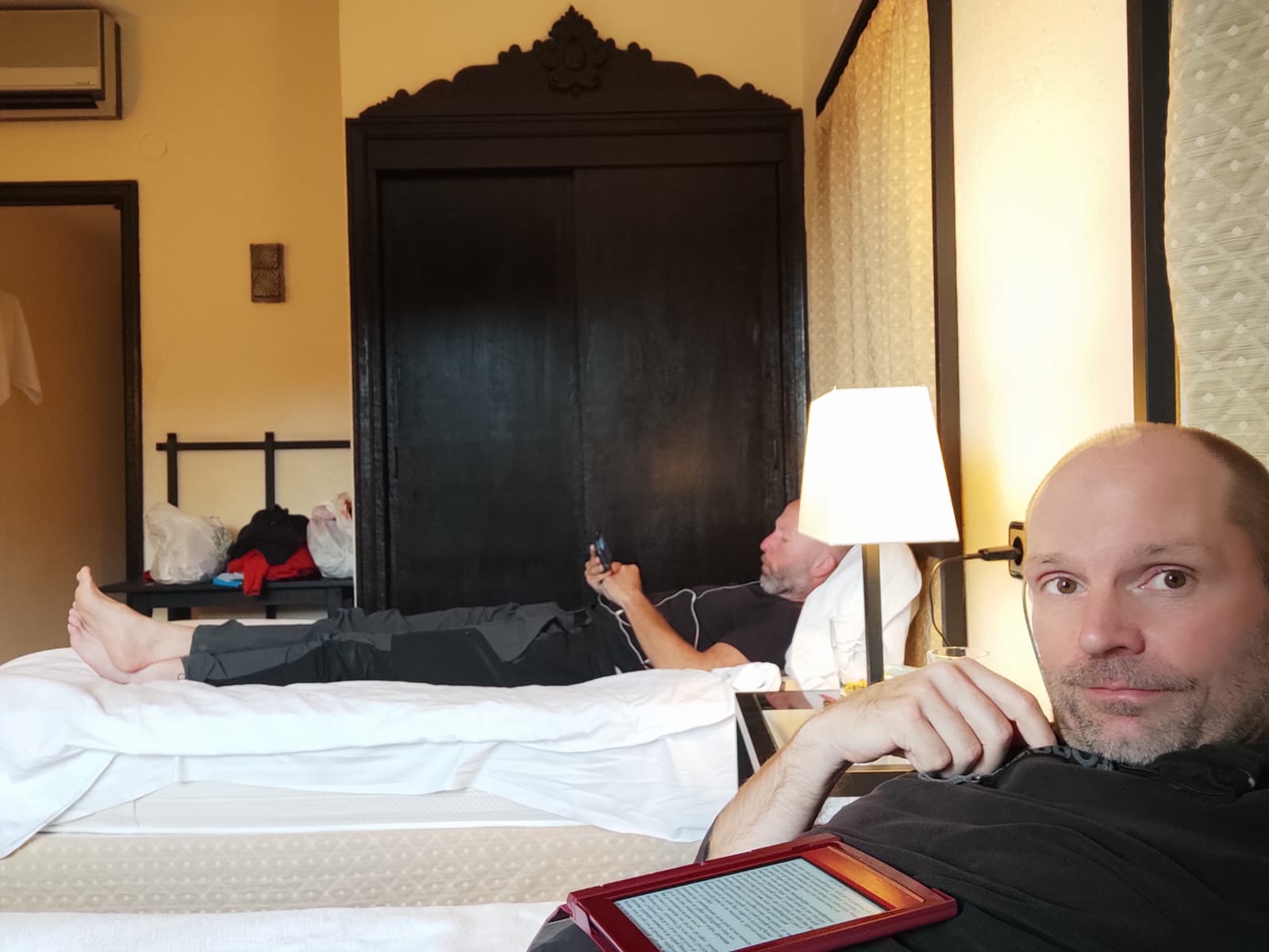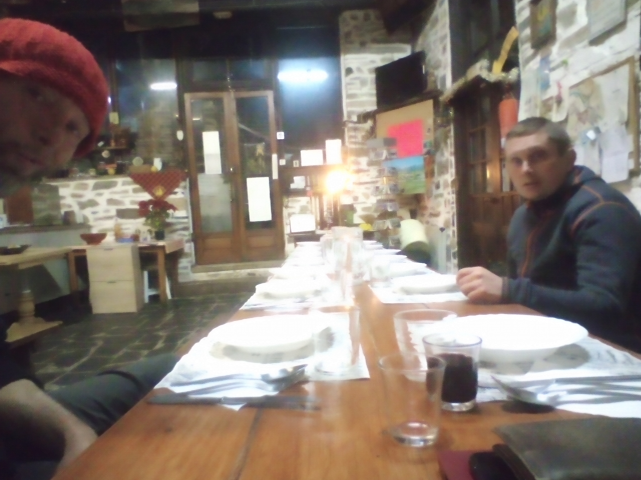 Dit zijn zo de conversaties die wij hebben op 1 januari tijdens het ontbijt. On half twaalf trekken we ons terug voor lezen, film kijken en badderen. Om beurten in het bad, we zijn nog niet zo heilig dat we het water delen. Brrr gelukkig niet… Na een korte avondwandeling met hamburger gaan we daar gewoon weer mee verder.