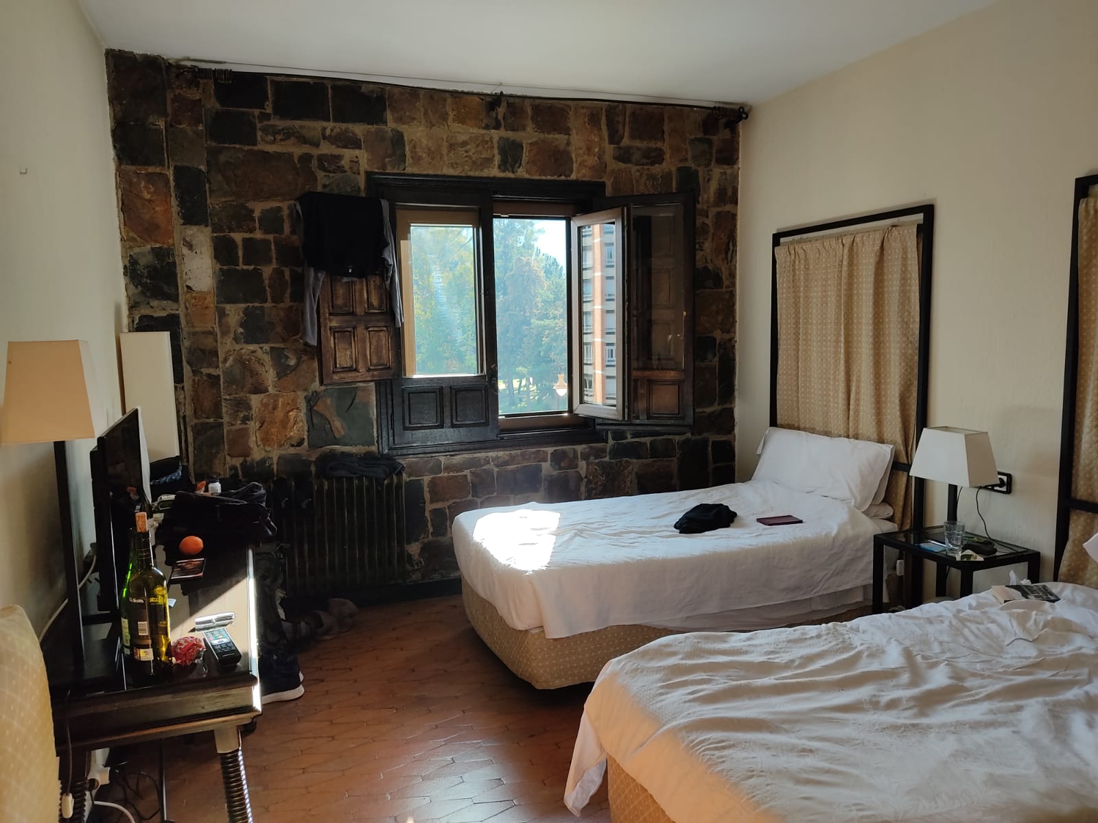 We hebben het hotel gekozen vanwege het thema ridderstyle (Tempeliers). Als we binnenkomen hoge balken plafonds, een ridder die de wacht houdt in de centrale hal, overal zware antieke kasten, ridderkunst aan de muur, pilaren en middeleeuwse teksten in steen gegraveerd. Het bad in de kamer helpt ook…