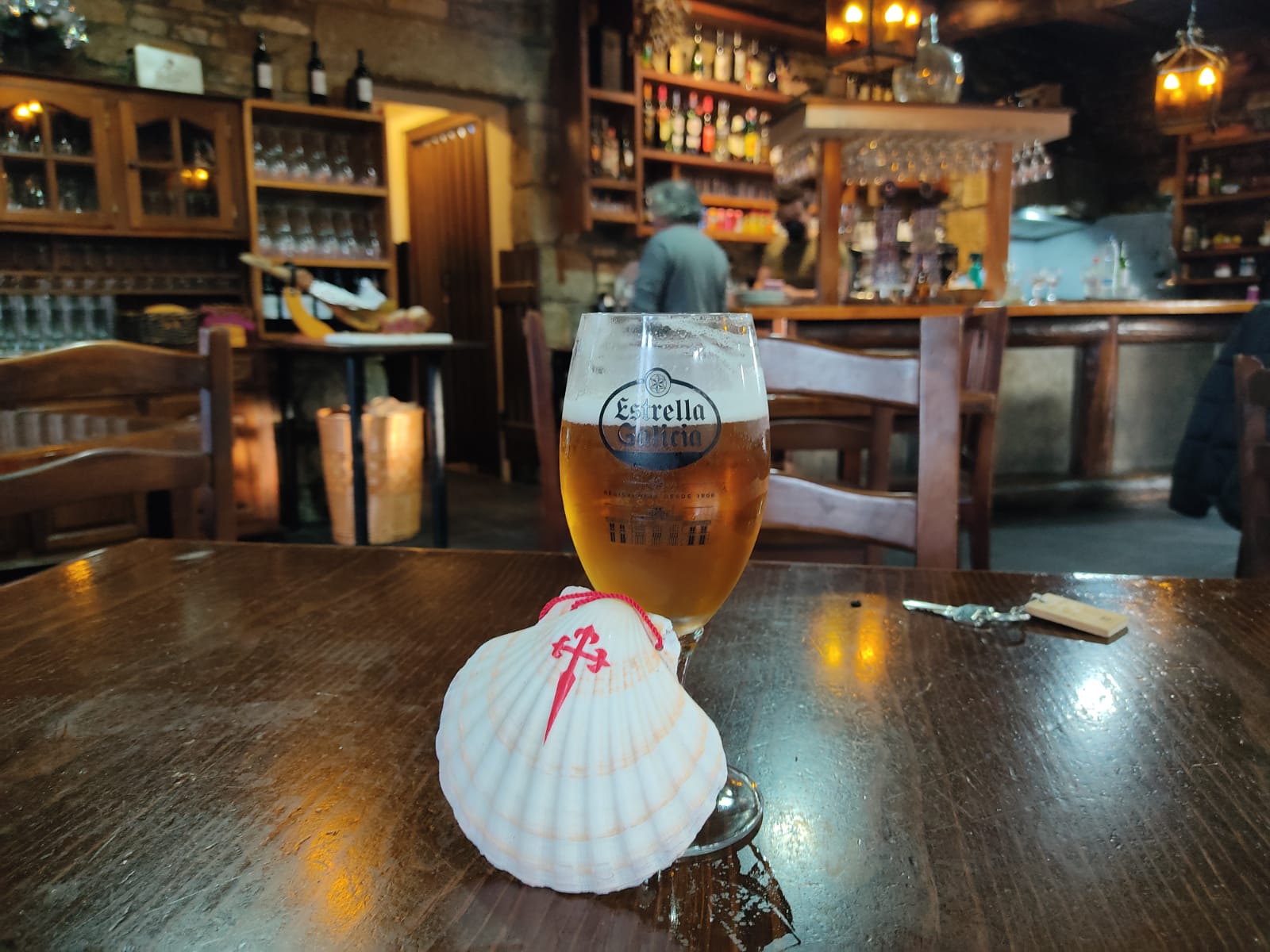 Wat volgt is een Godenmaal van een volgepropte groentesoep, Caldo Caleggo, een traditionele Galicische groentensoep en een bord met patatten, stukken ham en hompen brood. Toe krijgen we koeienkaas met eigengemaakte honing. Als we over en weer koeien, geiten en schapen nabootsen met de barman, krijgt iedereen de slappe lach. Om af te ronden bestelt Marcel, die in enkele dagen vloeiend Spaans is gaan spreken, een koffielikeur. De bonte avond kan niet meer stuk.