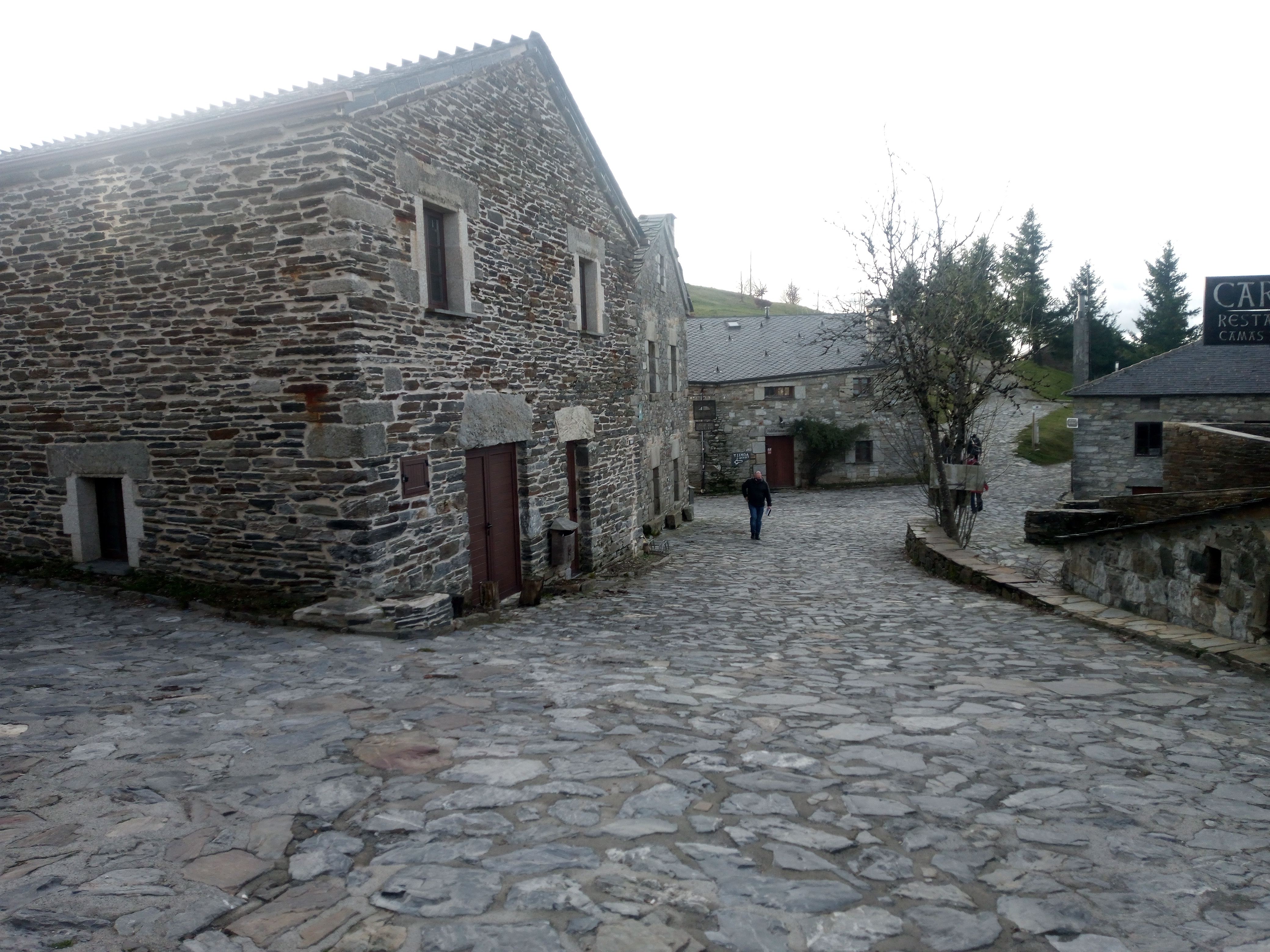 Na een ruime 30 kilometer komen we aan in O Cebreiro, een klein gehucht, helemaal van steen. Steen is het element van Marcel dus hij is helemaal in zijn hum. Cebreiro is een belangrijk punt voor de pelgrims naar Santiago de Compostela. Het is de laatste echte grote klim op de route. Het kan er flink koud zijn.