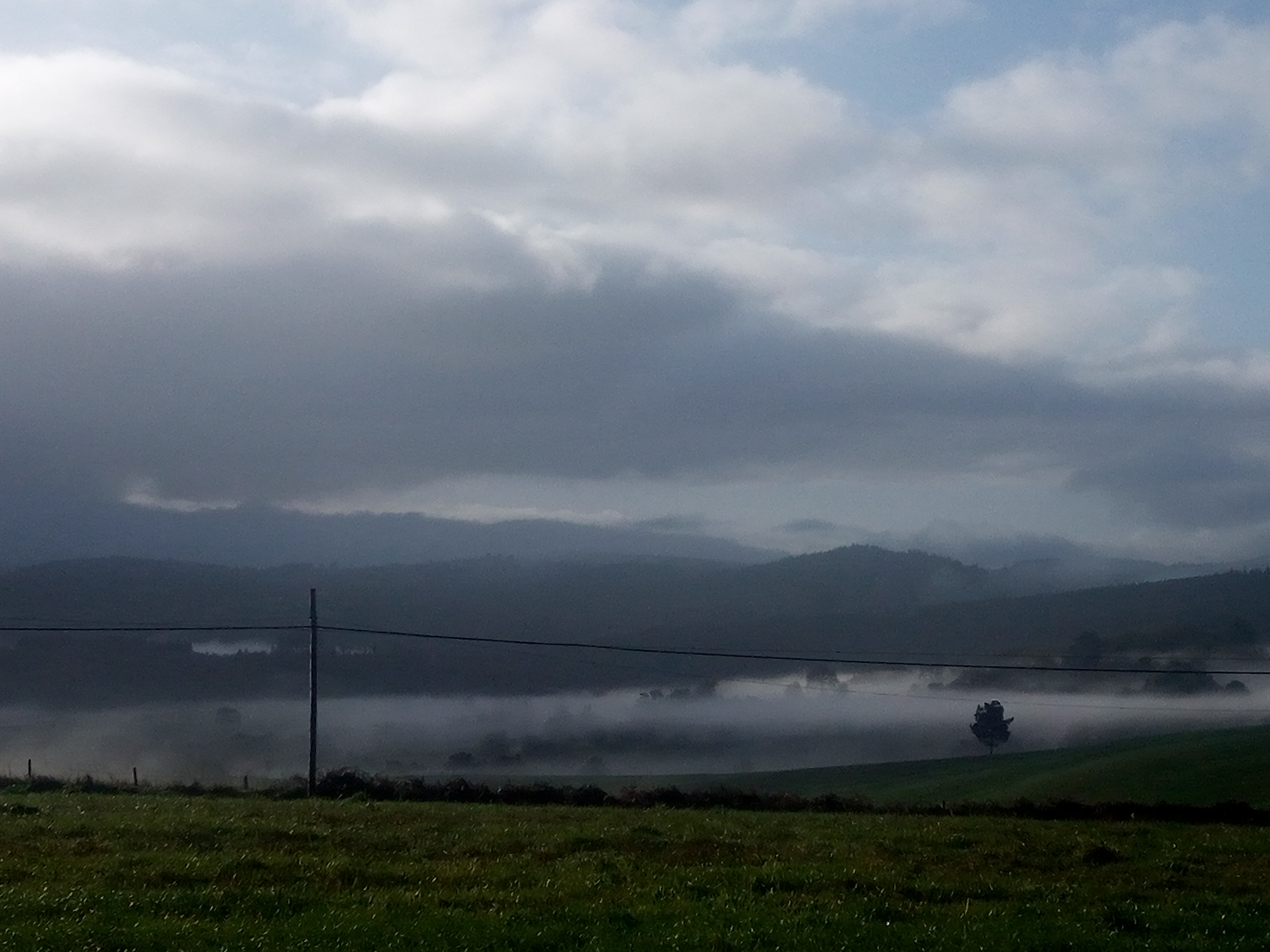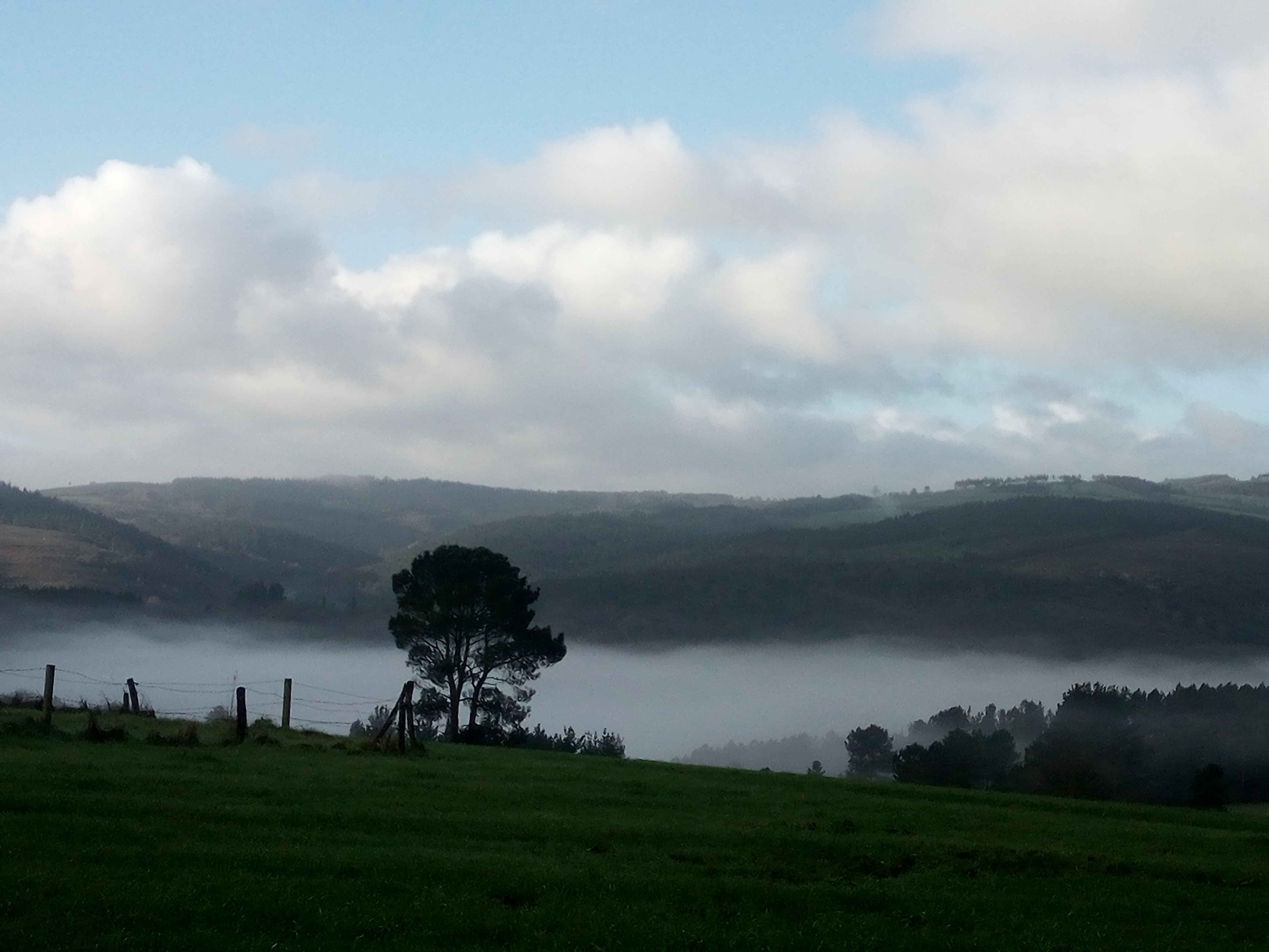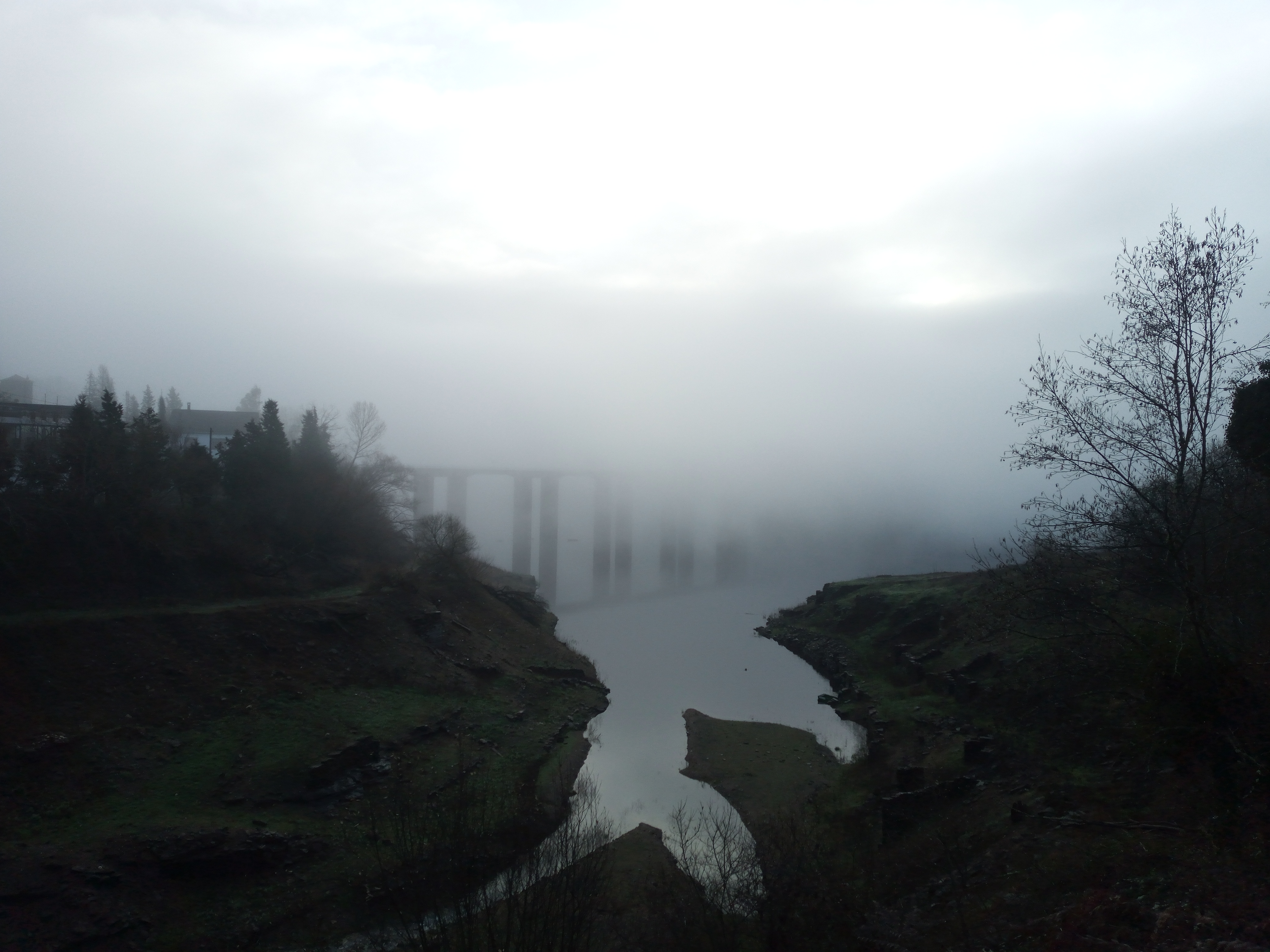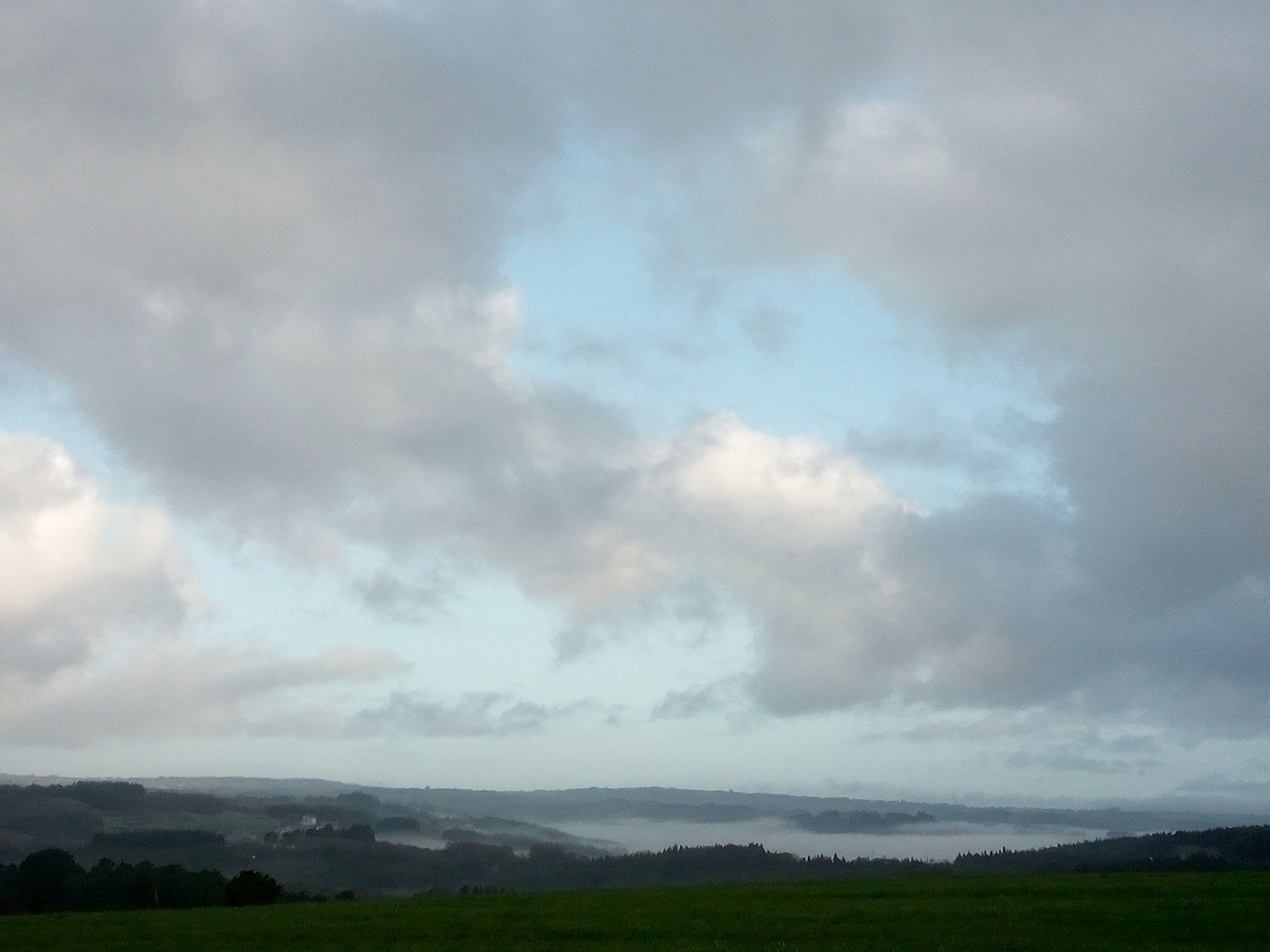 Er hangt dikke mist in de vallei, boven de rivier. De lange brug naar Pontmarin steekt er spookachtig doorheen. Het is een prachtige, frisse herfstdag. Al snel klim ik uit de wolken en kijk neer op het witte wolkendek dat het dal bedekt. Ik ben in mijn element en ren lekker door. Ik haal vandaag 14 pelgrims in. Ongelooflijk, waarom strompelt iedereen zo? Ik weet zeker dat ik tenminste het vijfvoudige heb gelopen. Ik waan me bij de Marathon des Sables; na drie dagen kan niemand meer fatsoenlijk voortbewegen…