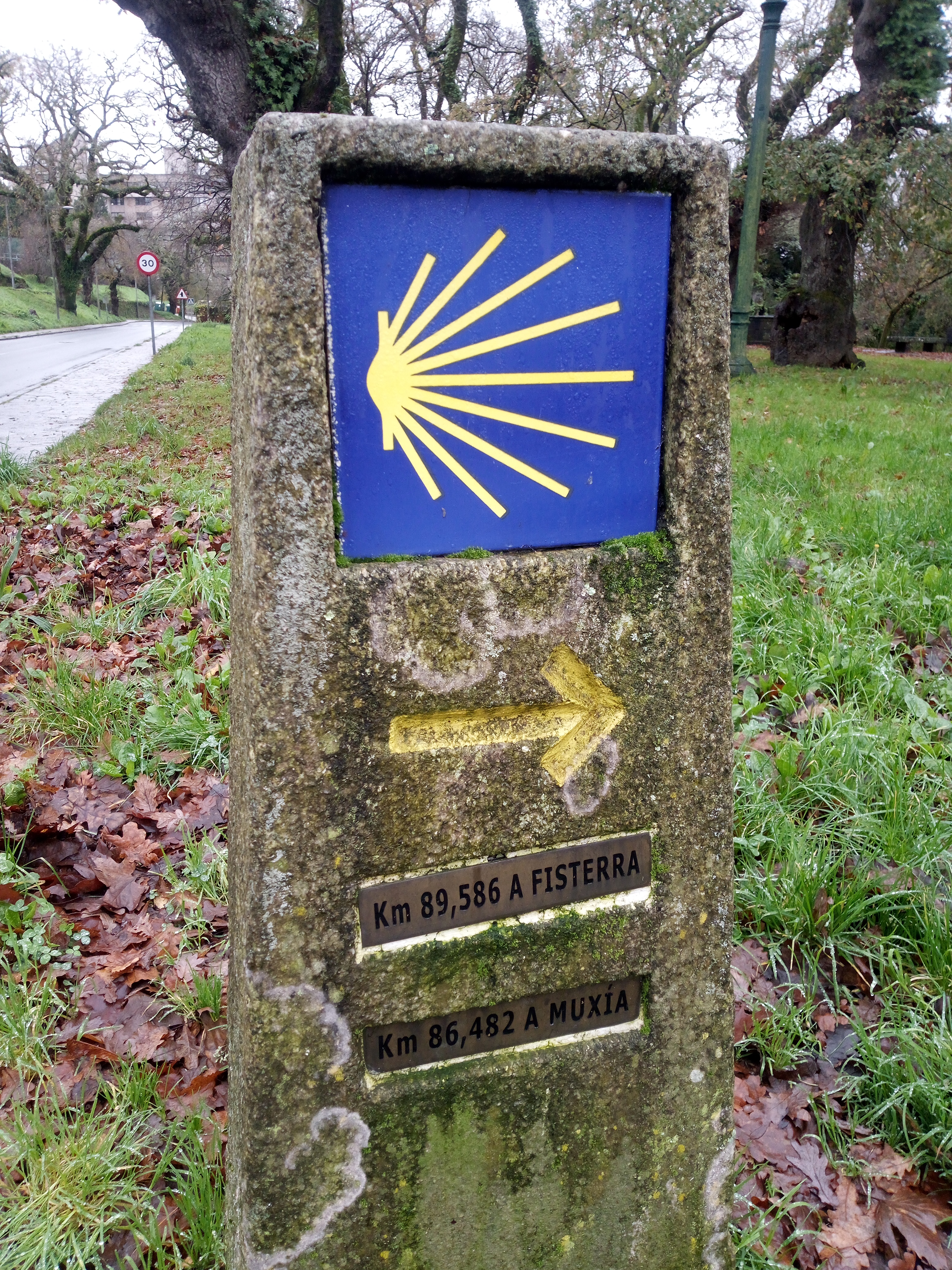 Ik blijf gewoon gele pijltjes volgen en ziedaar: een paal met de afstand tot Finisterre en Murcia. Een tocht met aan het eind een rondje zodat je beide plekken kunt aandoen. Finisterre staat voor 90,1 op de borden. Vanaf daar is het 29 kilometer naar Murcia en dan ook weer zo’n 90 terug naar Santiago.