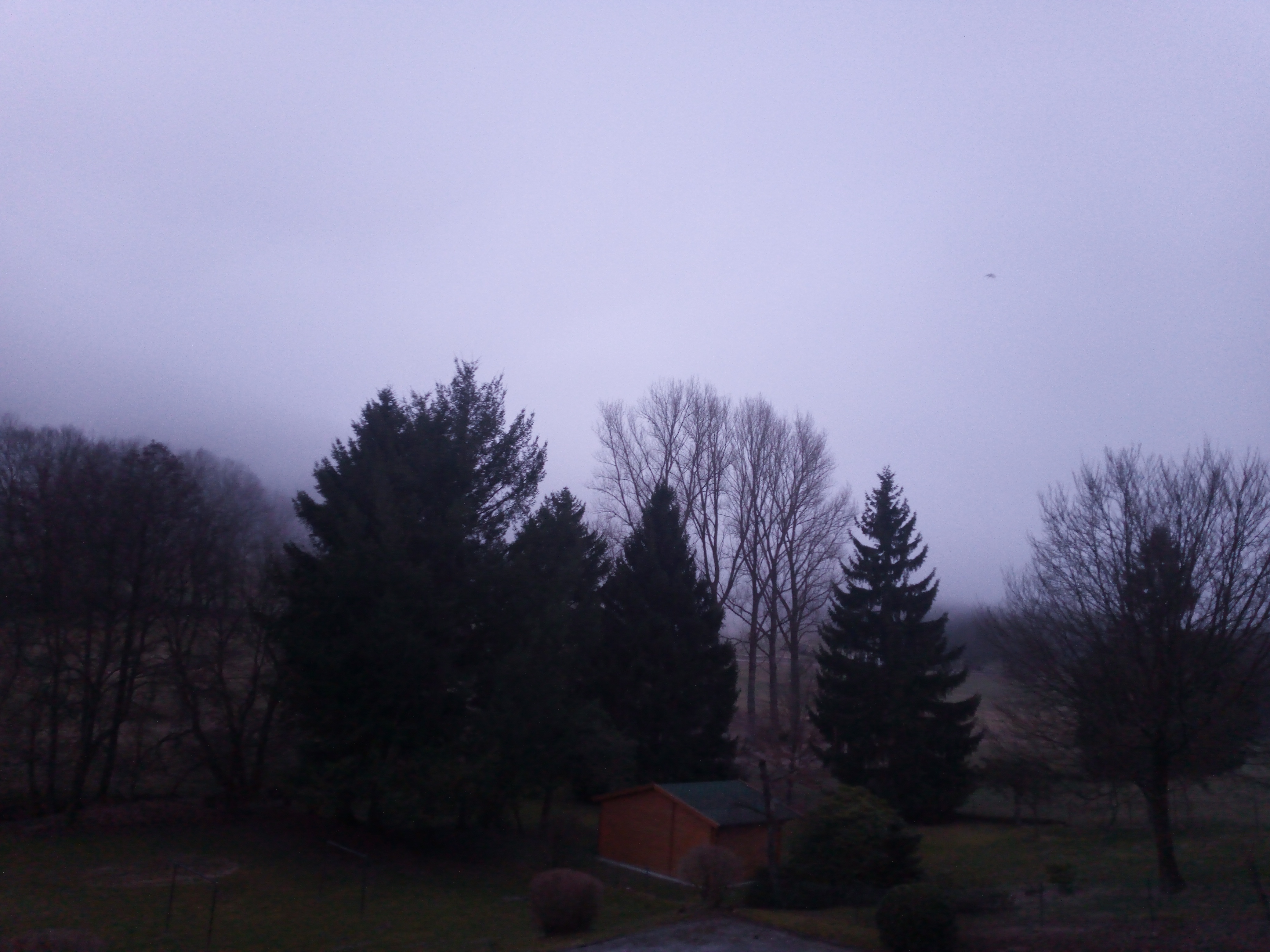 De aanblik op een helling met donker dennenbos. Daarvoor velden doorsneden met rijen kale loofbomen. Halverwege de helling begint een deken van mist die alles doet vervagen. Boomtoppen verdwijnen, vogels die overvliegen vervagen in vlucht.