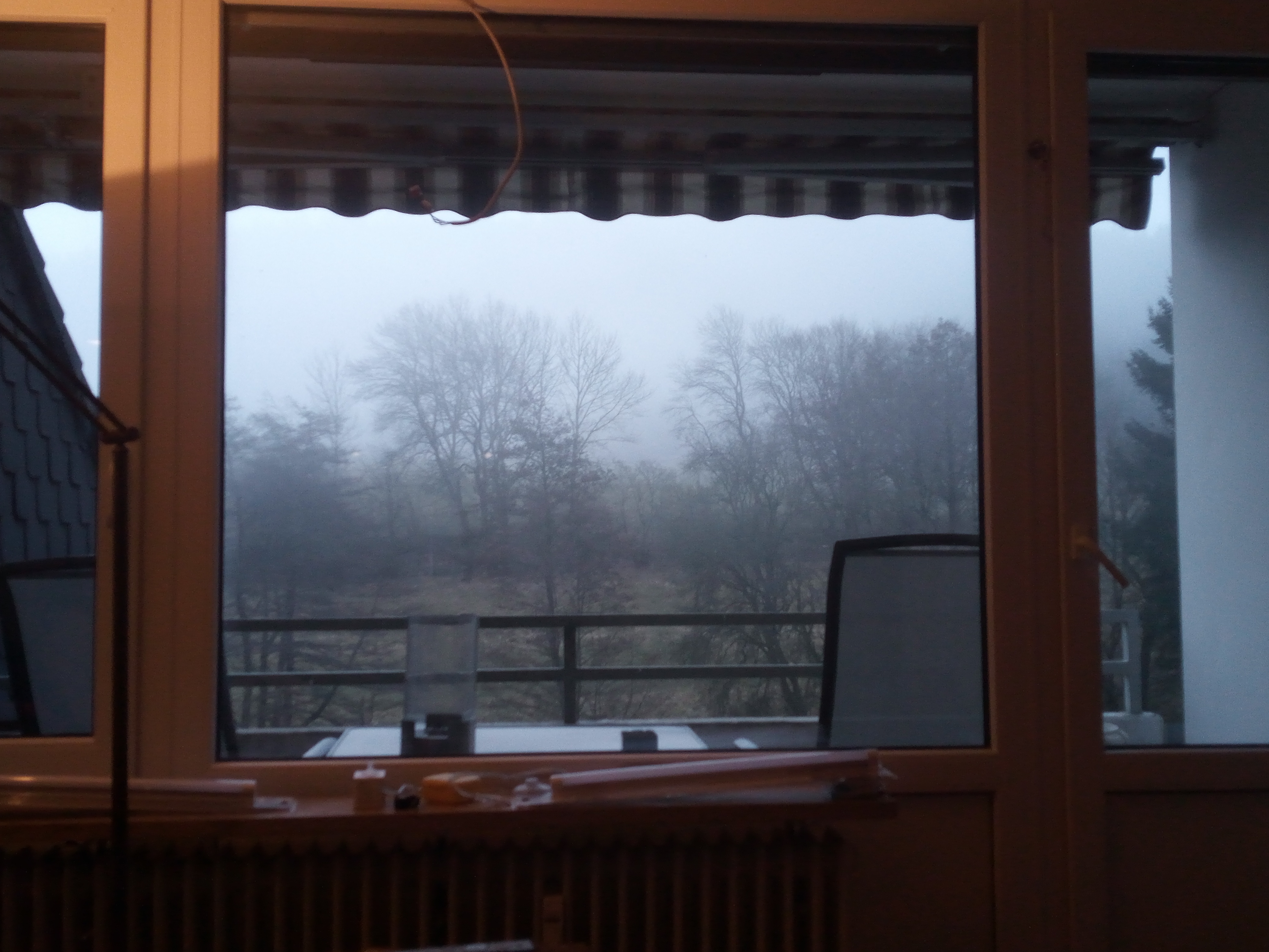 De wereld nog loom door de deken van nevel, kleuren in het blauwspectrum die langzaam verschuiven naar geel. Verdikkingen van nevel trekken tegen het dennendak aan het oog voorbij. De huiseekhoorns laten zich niet zien in de tuin. Gelukkig is er wel de Diemel die zich van de bron iets hoger op de helling meanderend een weg baant naar Diemelsee.