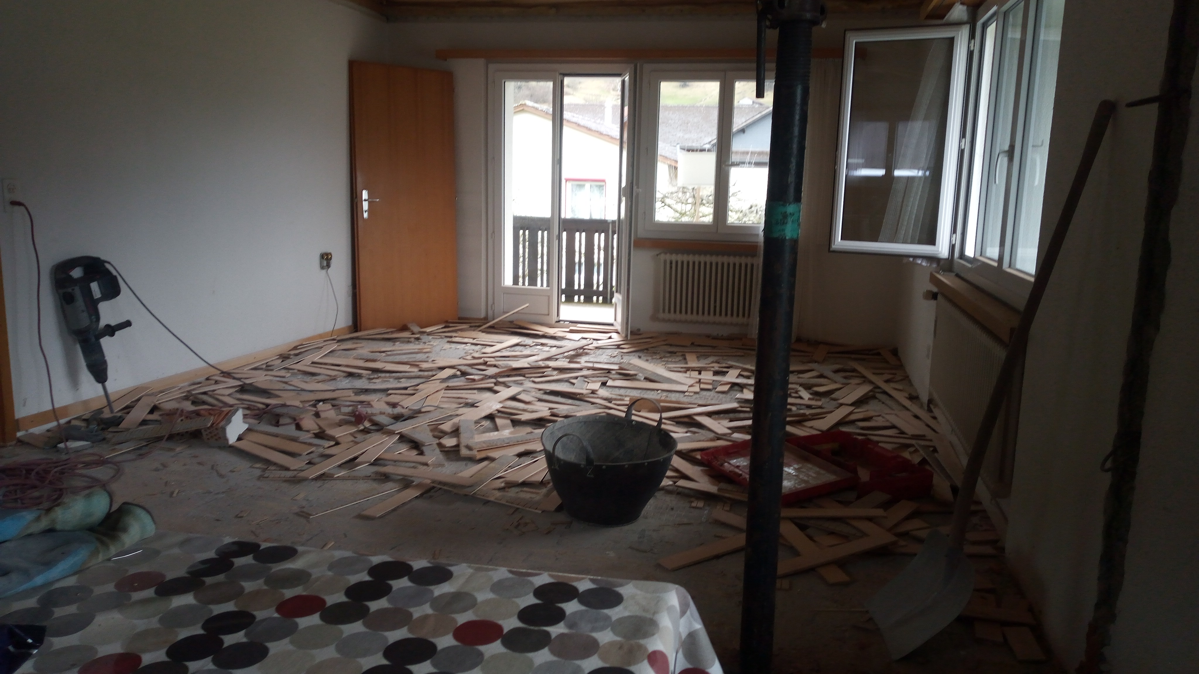 Leander buigt zich ondertussen over het gelijmde laminaat in de woonkamer met zijn boorapparaat dat ik afvoer met een cementteil, weer 10.000 treden. Maarten heeft koppijn en richt zich op enkele sleuven voor elektriciteit, een belronde en wat hand- en spandiensten voor de mannen die de regelunit van de vloerverwarming aanleggen. De beste mannen vinden het niet zo tof dat ik met de sloophamer boven hun hoofd naast een groot gat de betondeklaag ga zitten stukjanken. Meld je dan even bij me. Of ik een plaat over het gat wil doen? Eikels.