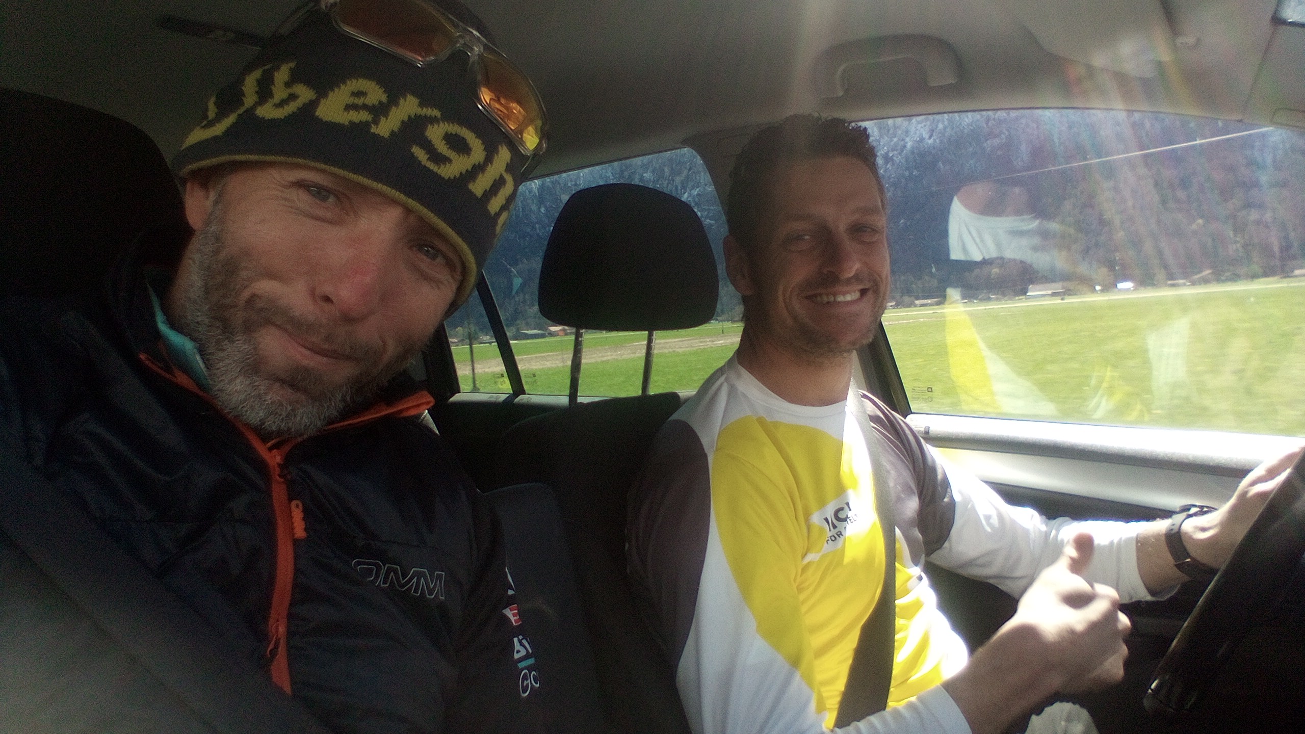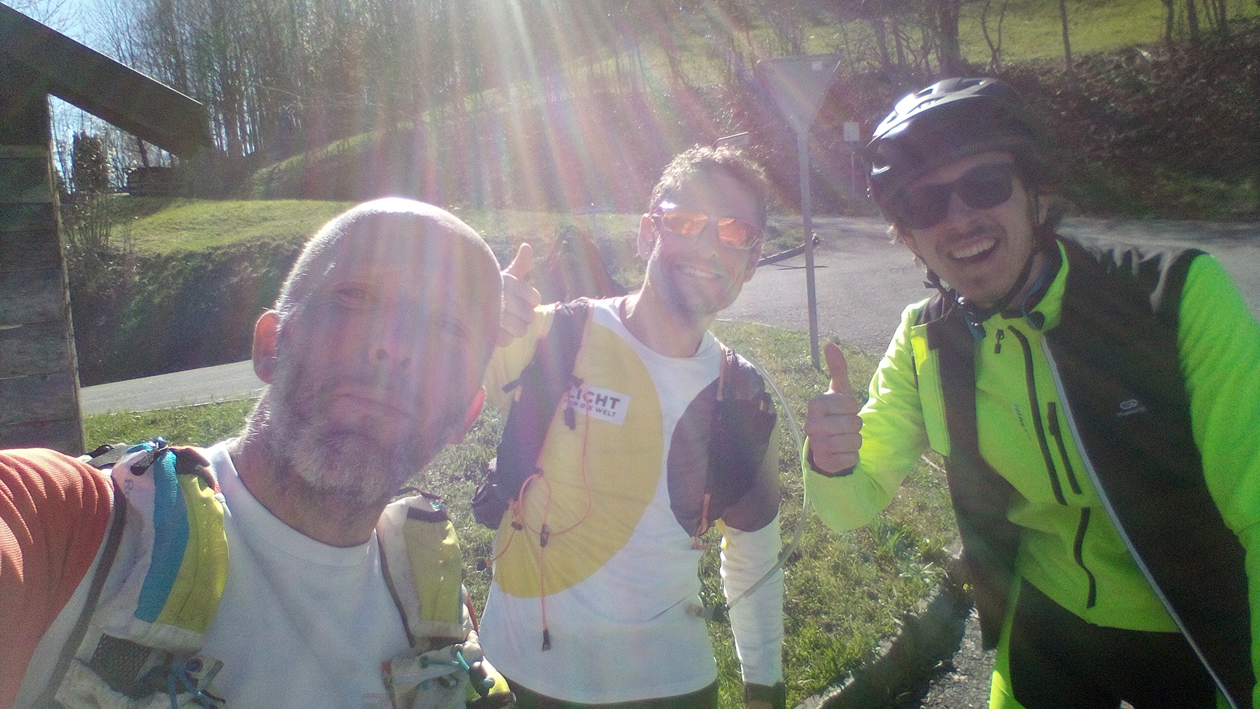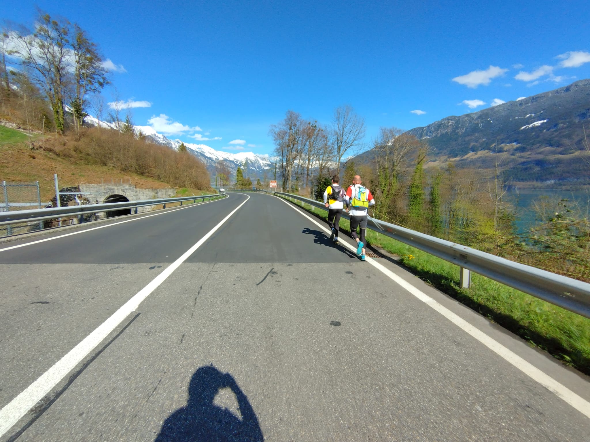 De eerste tien rossen we er ondanks hoogtemeters binnen het uur doorheen. Fuck, dat is echt veel te hard. Dat ga ik bezuren. Leander appt ondertussen dat hij met de racefiets op de rug op een of ander bospad aan het veldrijden is. Hij zit niet ver achter ons en heeft waarschijnlijk een foutje gemaakt. Hij vloekt. Een beetje. Wij knallen er nog zeven doorheen voor een pauze op een bankje bij Interlaken.