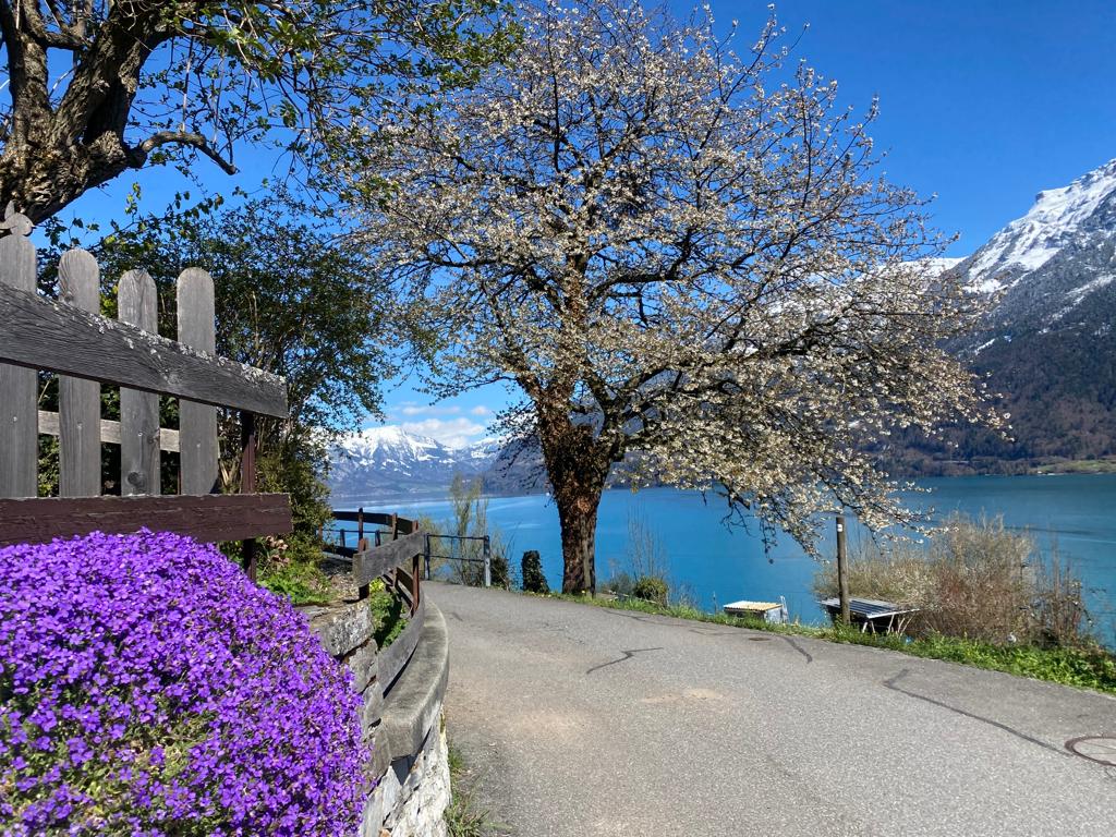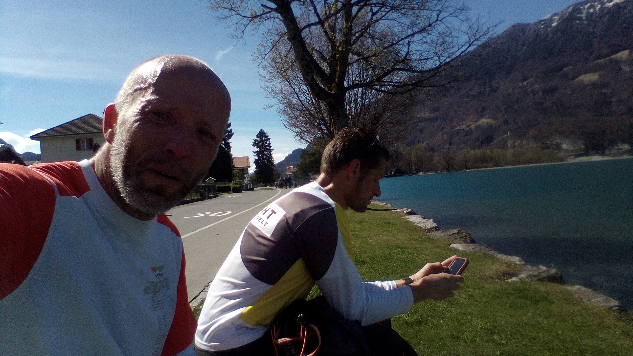 We worden onrustig. De loopkleertjes gaan aan en Maarten voelt als en renpeerd dat uit de stal moet. Leander het jonge veulen heeft de fietskleren aan. Hij rijdt van hier naar Brientz waar de ronde om de Brientzersee begint. (https://www.interlaken.ch/erlebnisse/tour/brienzersee-loop) Wij pakken de auto en starten daar. Hij zal ons bijhalen en vergezellen.
