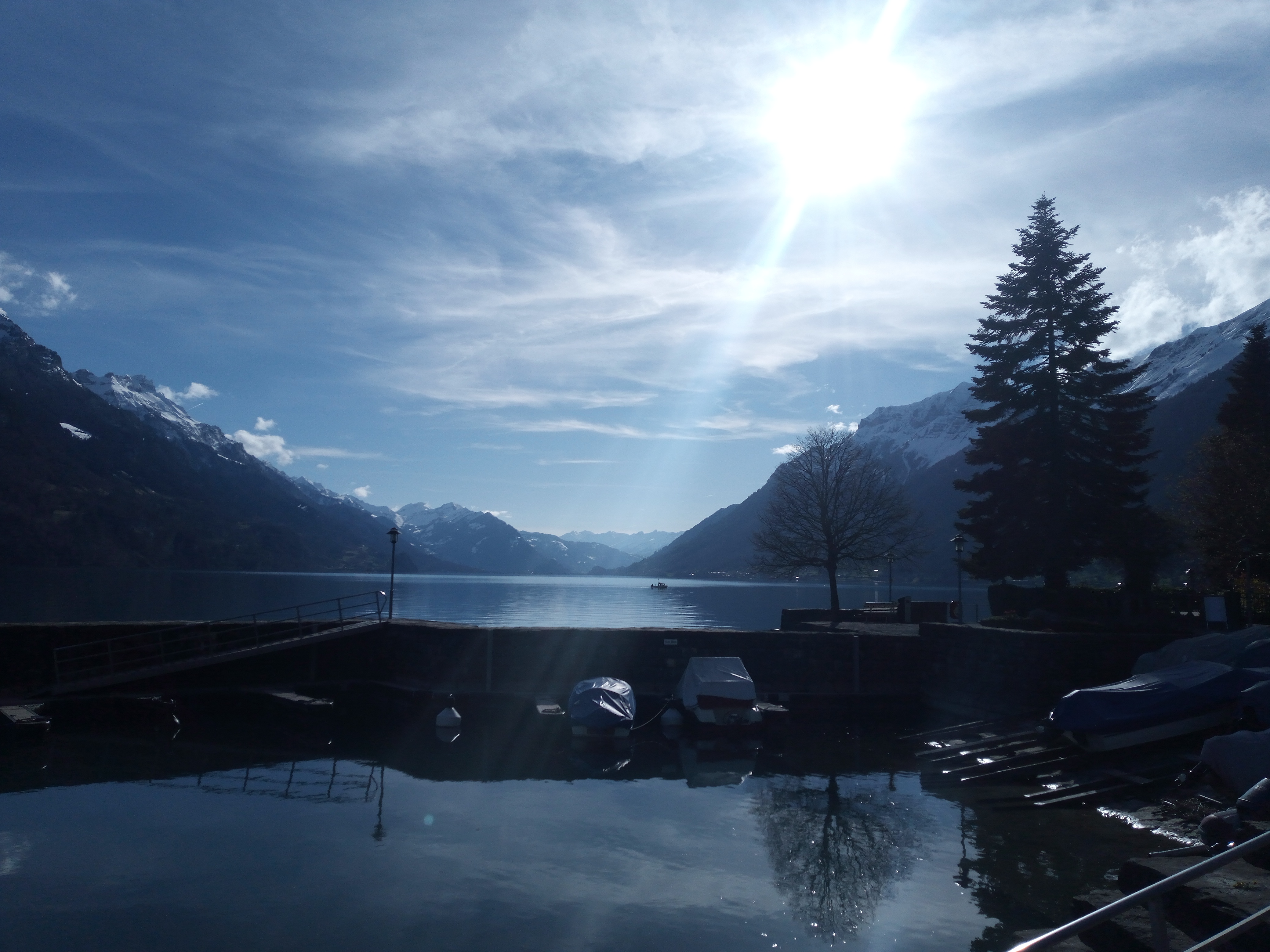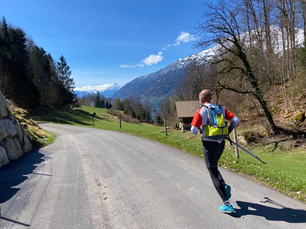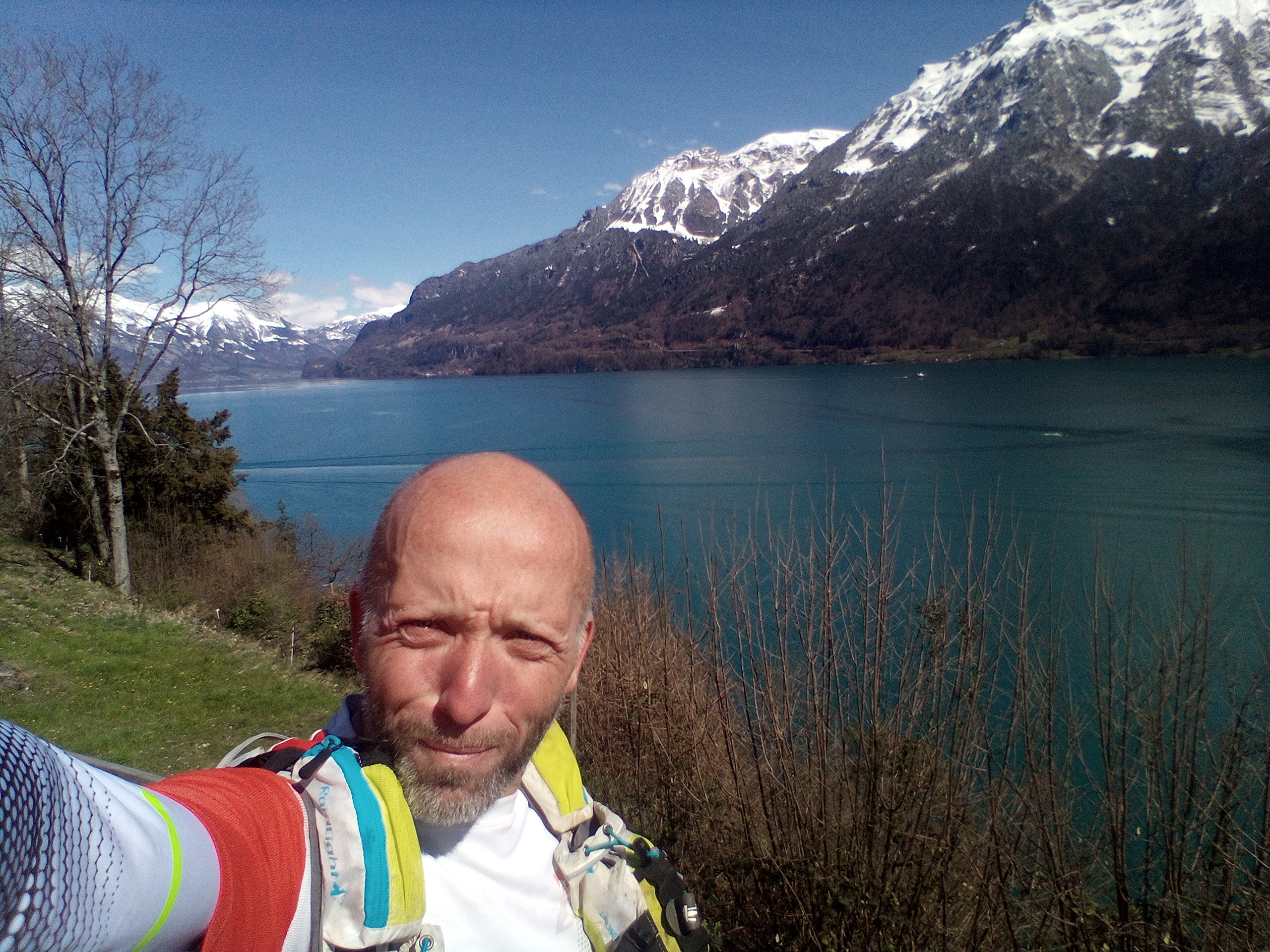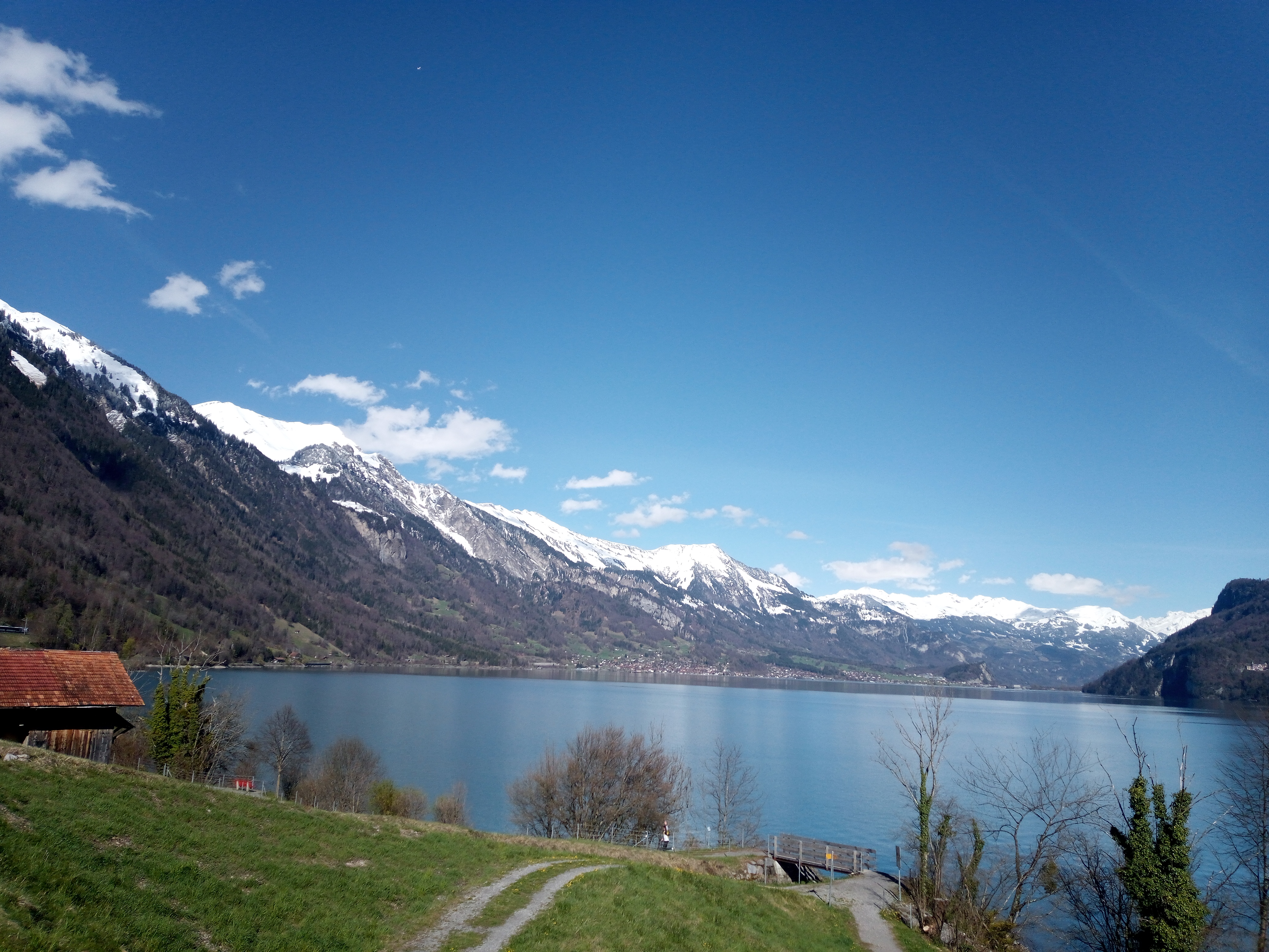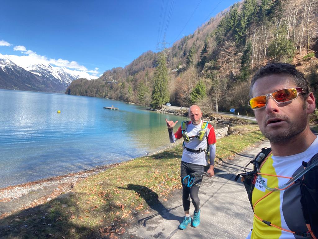 Onder ons de azuurblauwe Brientzersee die doorkliefd wordt door een rondvaartboot. Een wouw kringelt boven ons. Aan de overzijde de haarscherpe graat die ik zo graag nog eens wil rennen. De lente hangt in de lucht en met de verse sneeuw van vannacht ziet alles er maagdelijk uit. Aan het panorama en het weer ligt het niet.