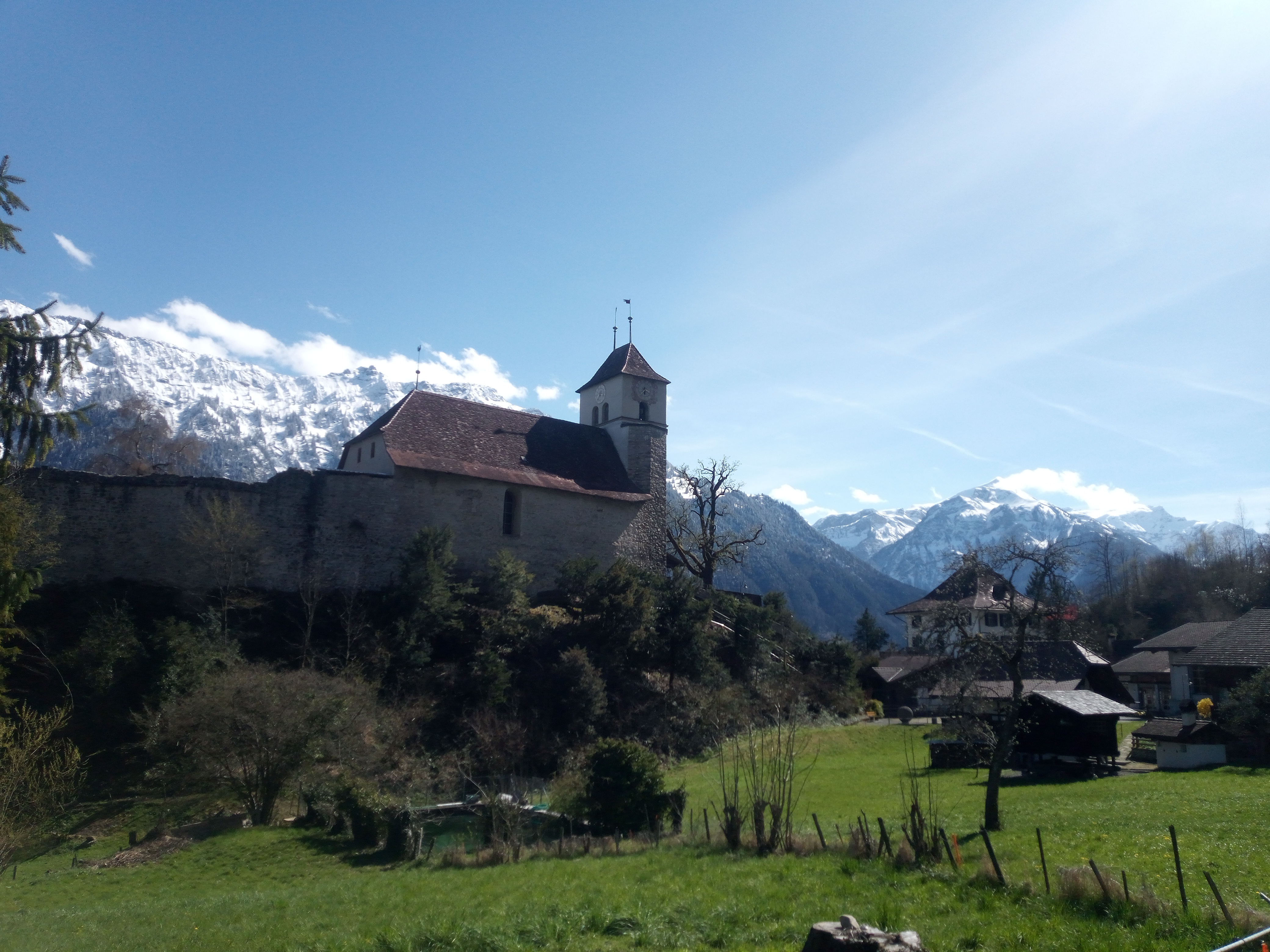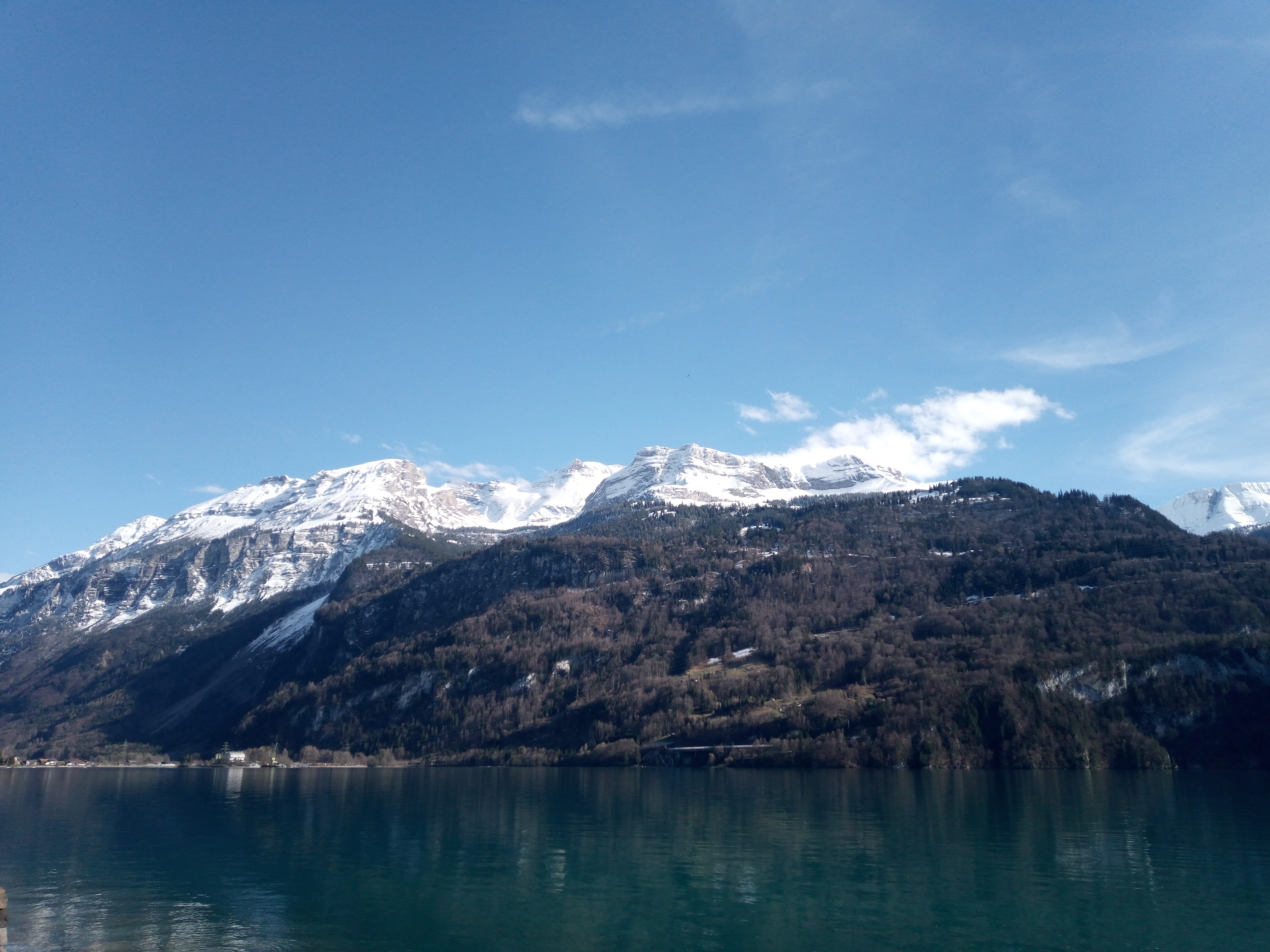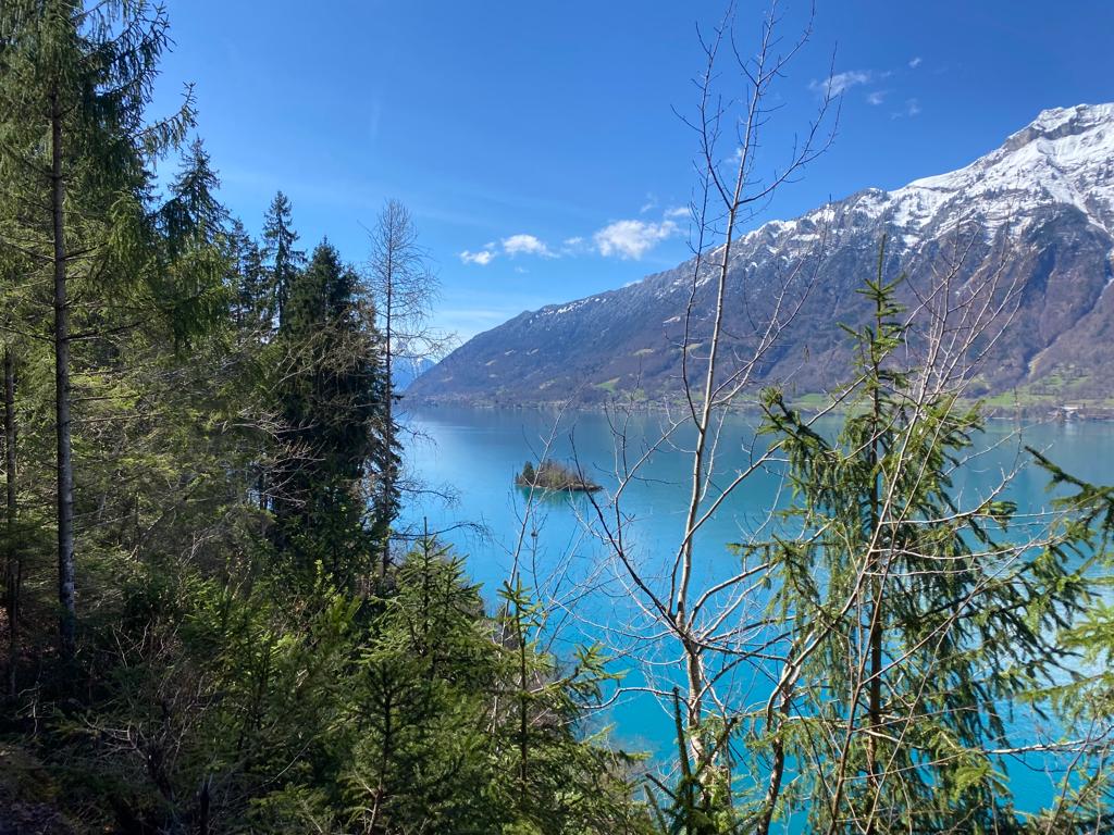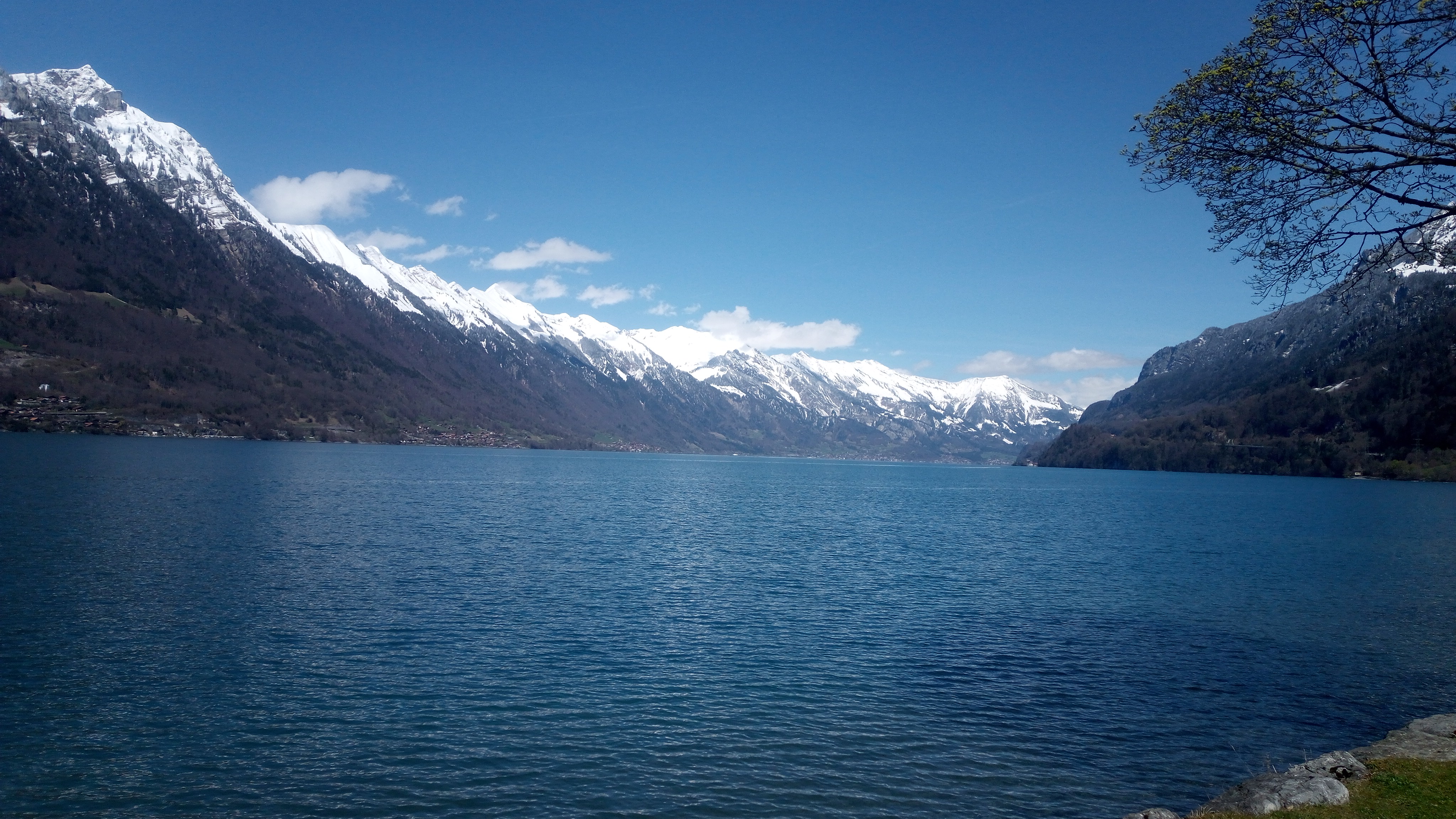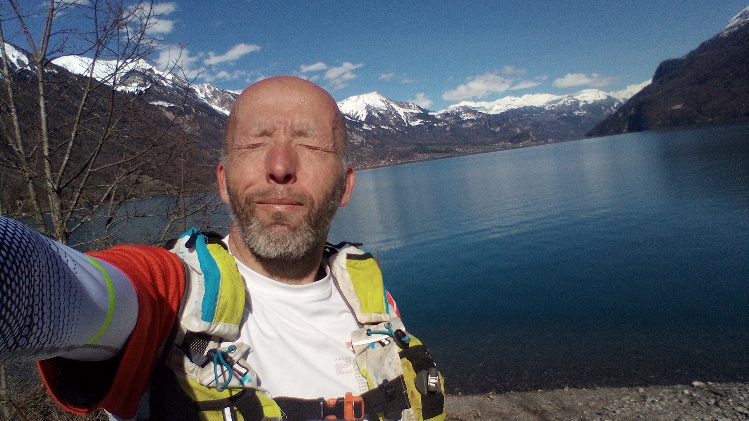 Onder ons de azuurblauwe Brientzersee die doorkliefd wordt door een rondvaartboot. Een wouw kringelt boven ons. Aan de overzijde de haarscherpe graat die ik zo graag nog eens wil rennen. De lente hangt in de lucht en met de verse sneeuw van vannacht ziet alles er maagdelijk uit. Aan het panorama en het weer ligt het niet.