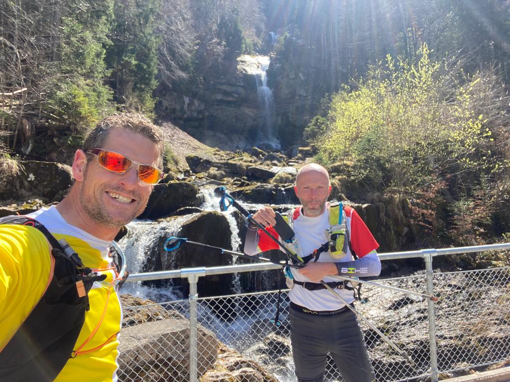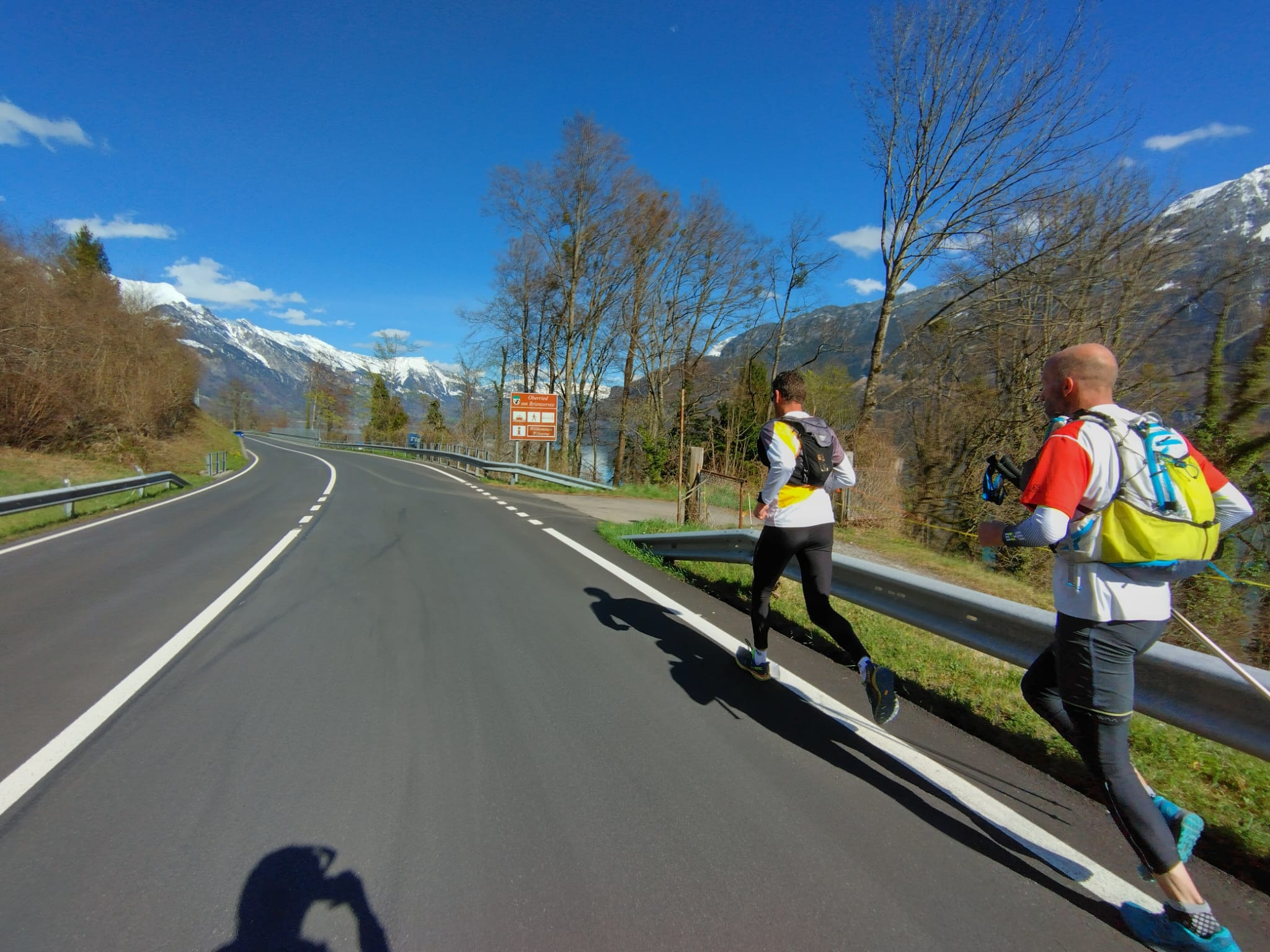 Als we geparkeerd zijn een highfive en voortvarend van start. Shit! Maarten die hier woont is een krachtloper die bergen verslindt nog voor de ochtendkoffie. Ik merk meteen dat ik als vetverbrandende diesel alle zeilen moet bijzetten om aangehaakt te blijven. Hij holt als een koe die de hele winter de wei niet in mocht en mijn hartslag kiert direct naar de 180. Als ik het benoem, roept hij dat die van hem 128 is. Dit wordt sterven .. morti te salutem.