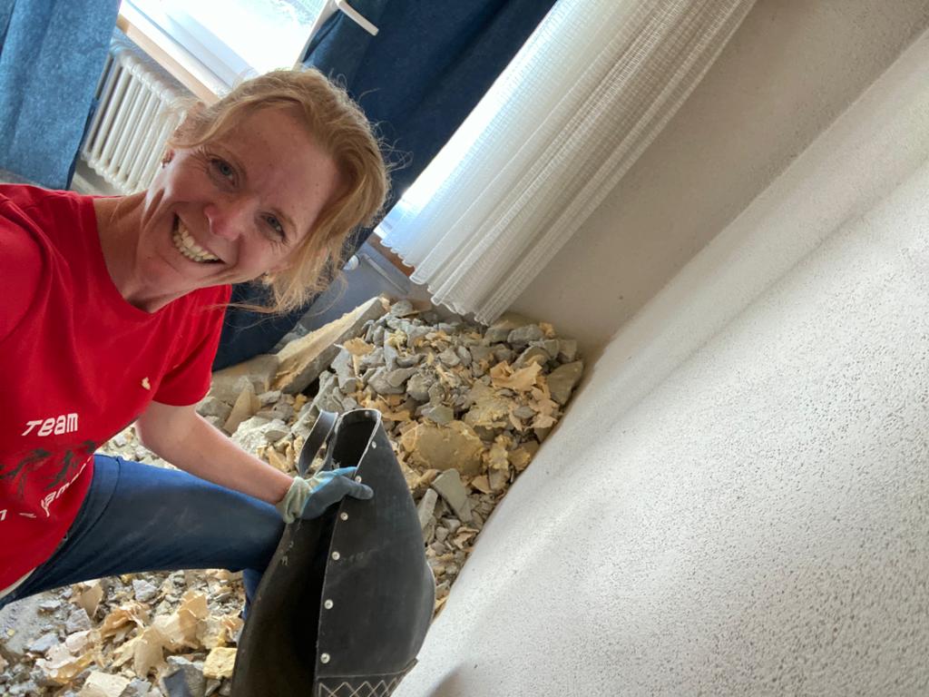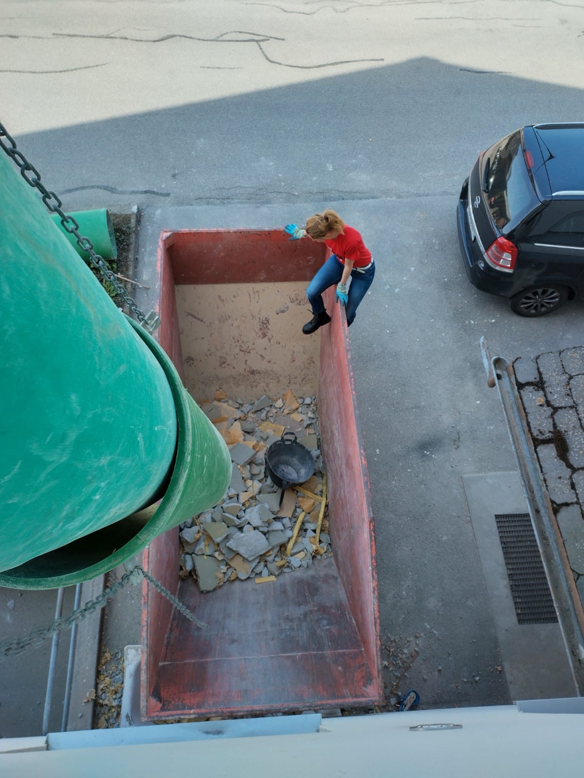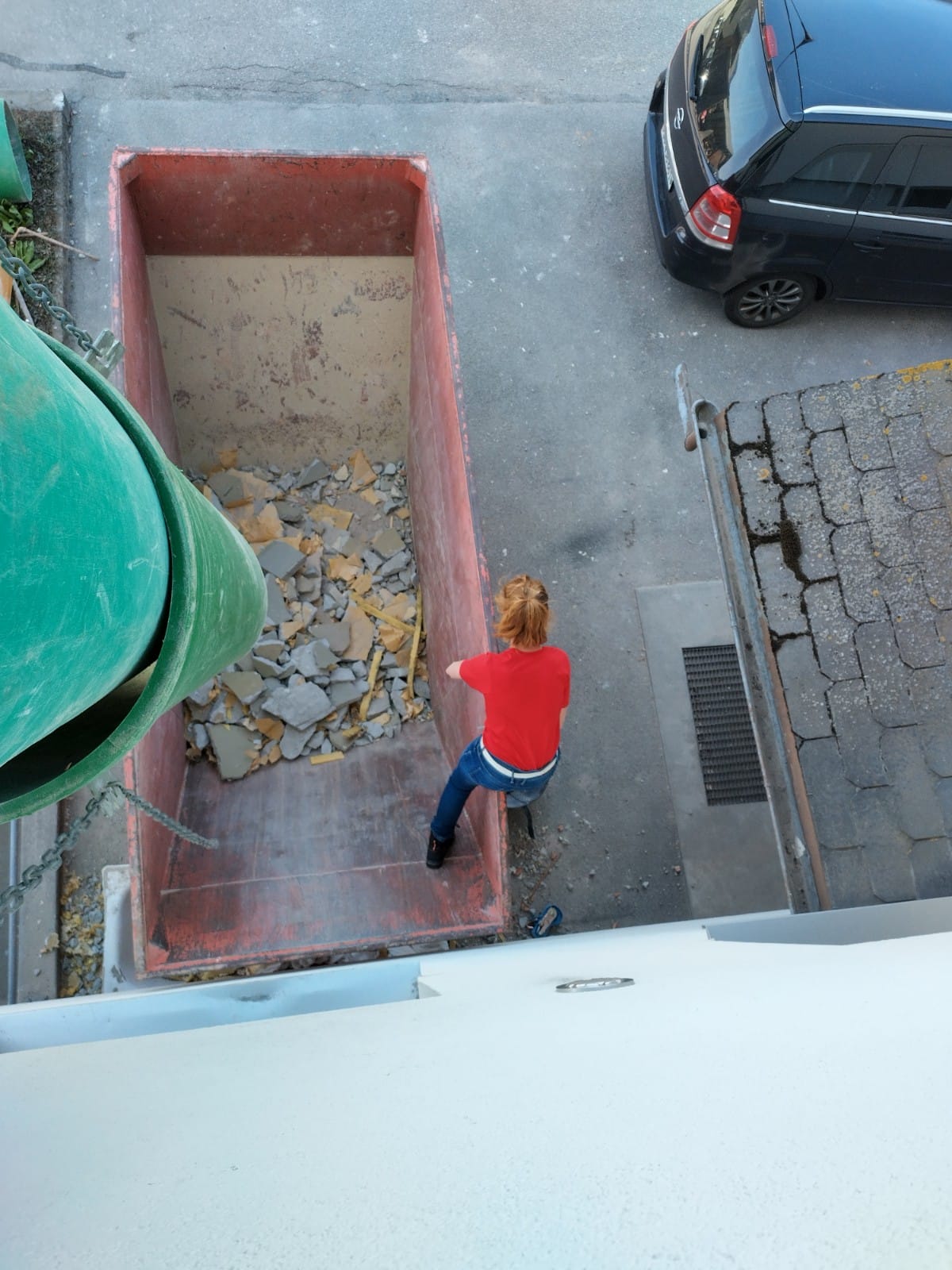 In het pand geven we nog even vol gas om de frustratie eruit te gooien. De nieuwe container is gearriveerd en in twee kamers hebben we de vloer eruit gerost en de brokstukken in een hoek opgestapeld. Maartje is vanmiddag al begonnen met de puinemmer om stukken af te voeren. Een van de eerste keren mikte ze niet alleen het puin, maar tevens de emmer door de stortkoker, iets dat mij uiteraard nooit gebeurd is…