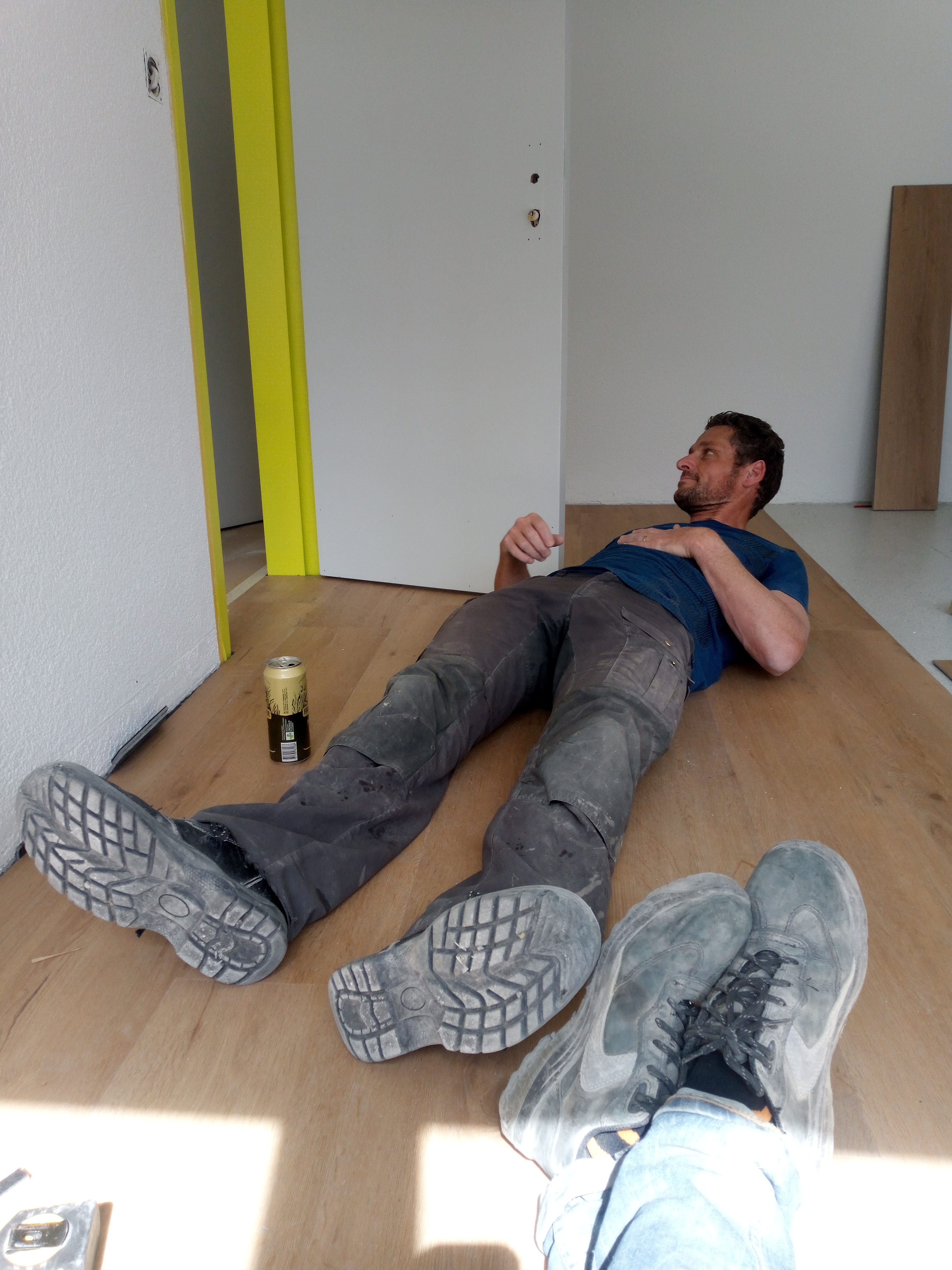 Samen rossen we er dertig emmers doorheen en maken een slaapkamer leeg. Biertje op het balkon. Maarten en ik grijnzen; zullen we dan nog maar een eindsprint doen en mijn slaapkamer ook leegtrekken? Ja hoor, weer vol gas en ook daar trekken we één kuub puin weg met de nodige oerkreten. Maar dan is het ook echt klaar en daarmee alsnog een voldaan gevoel na een dag inferieure vloeren leggen.