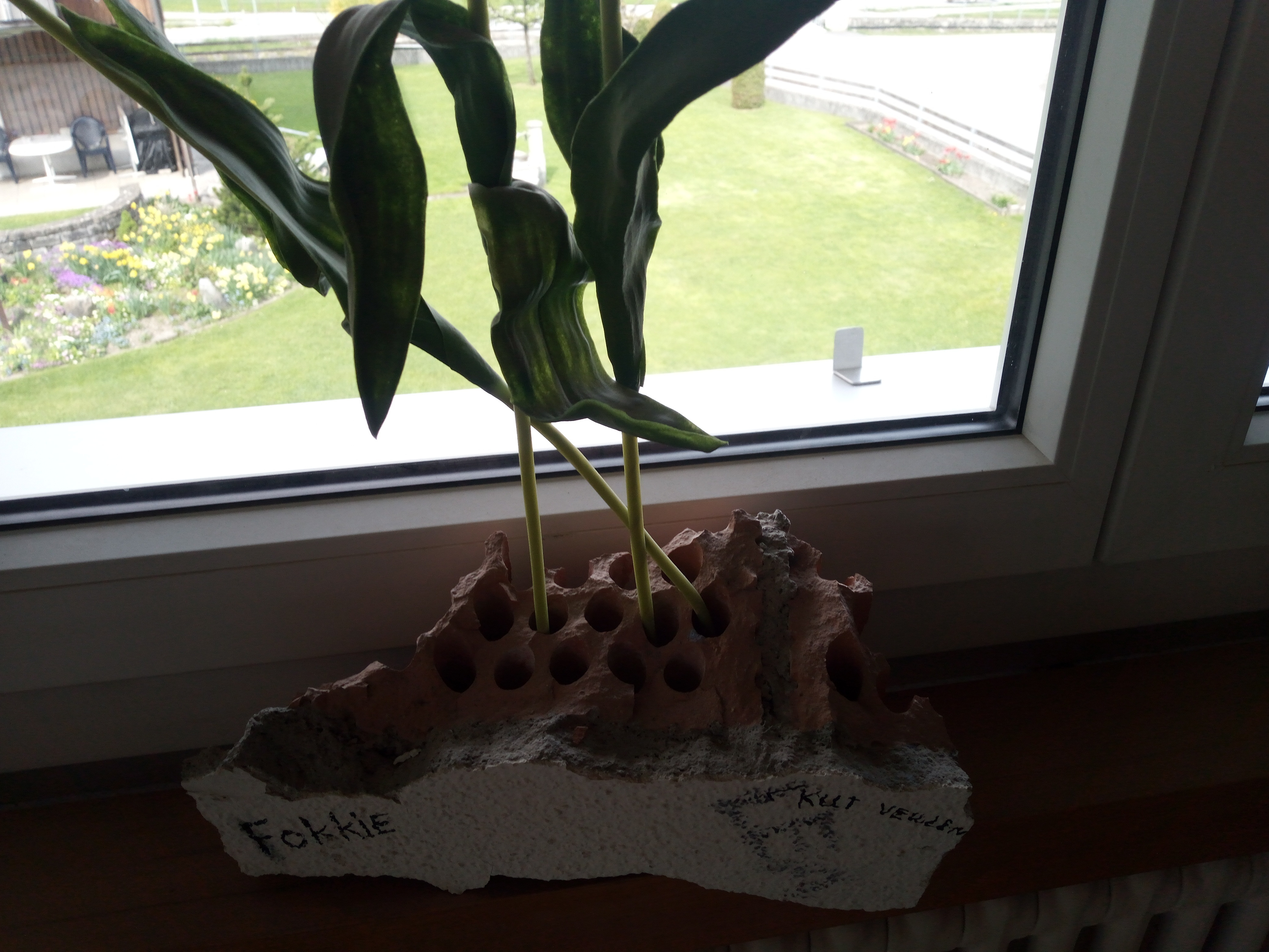 Ik fotografeer het monument dat Leander en ik eerder in het leven roepen voor gesloopte muren. Een memorabel moment, de puinfase is nu echt voorbij. In totaal hebben we vier containers volgesloopt en dat betekent dat in twaalf dagen 40.000 kilo puin door onze handen is gegaan evenals 2.000 kilo die naar de sloop is gegaan.