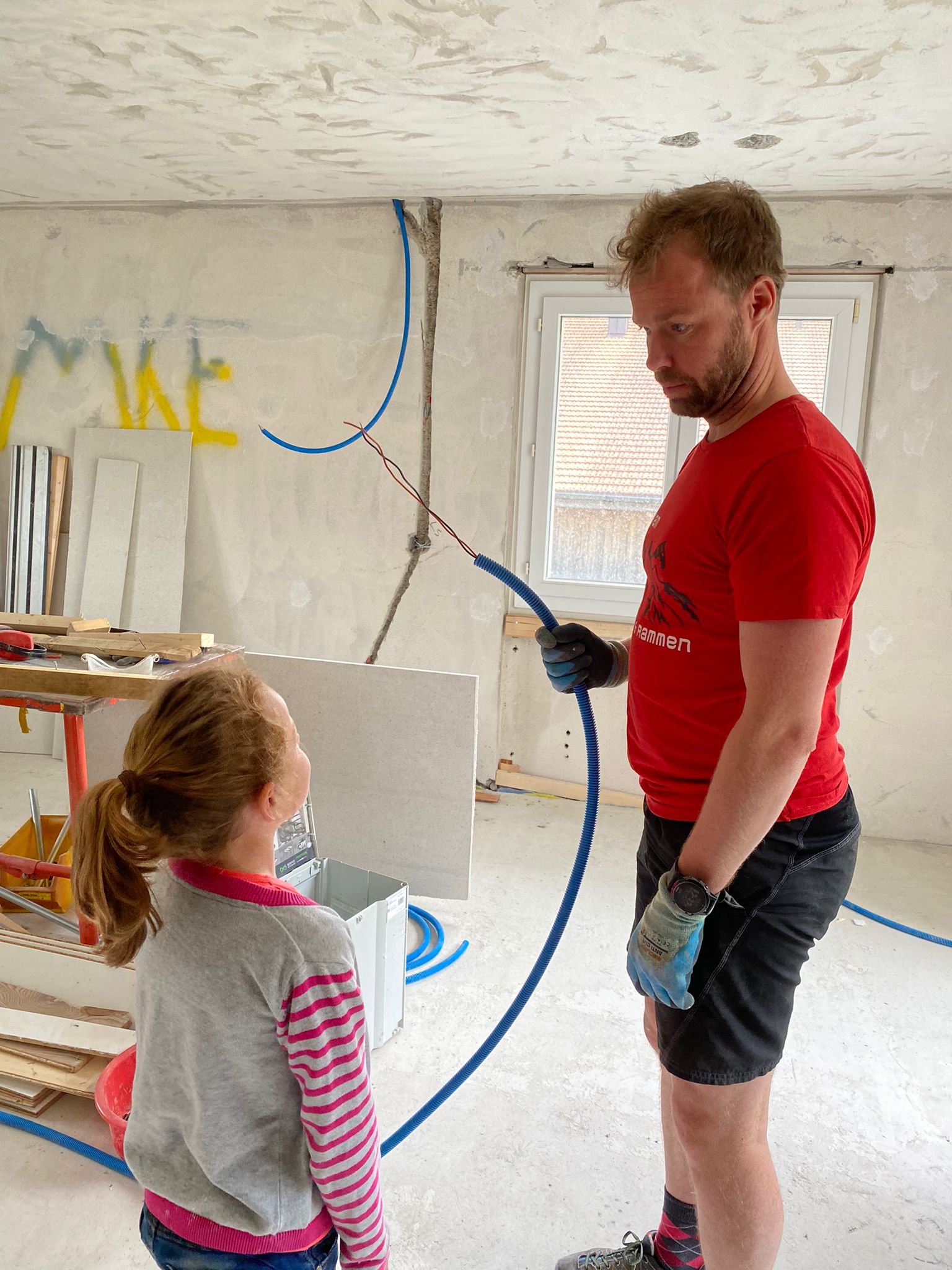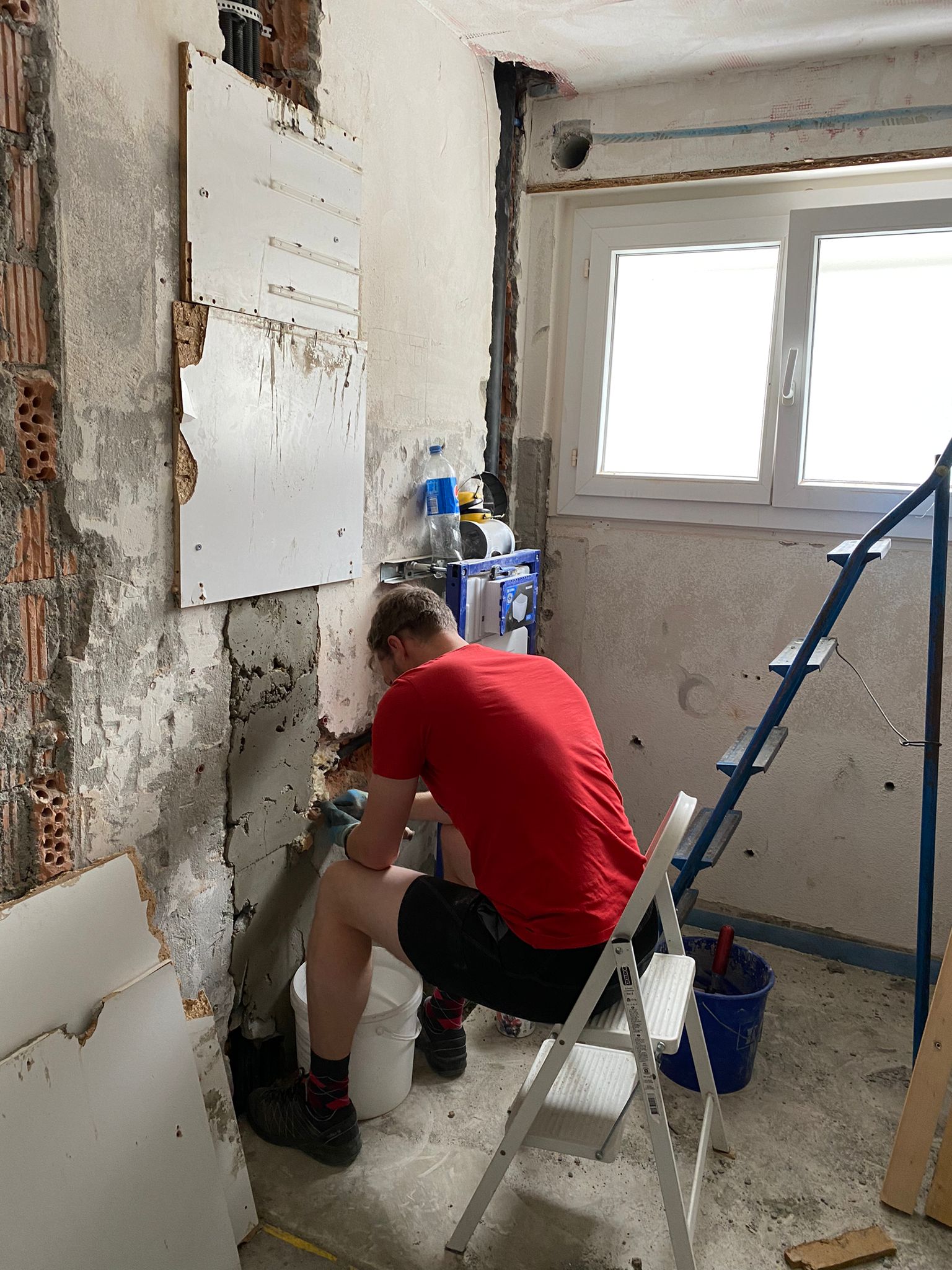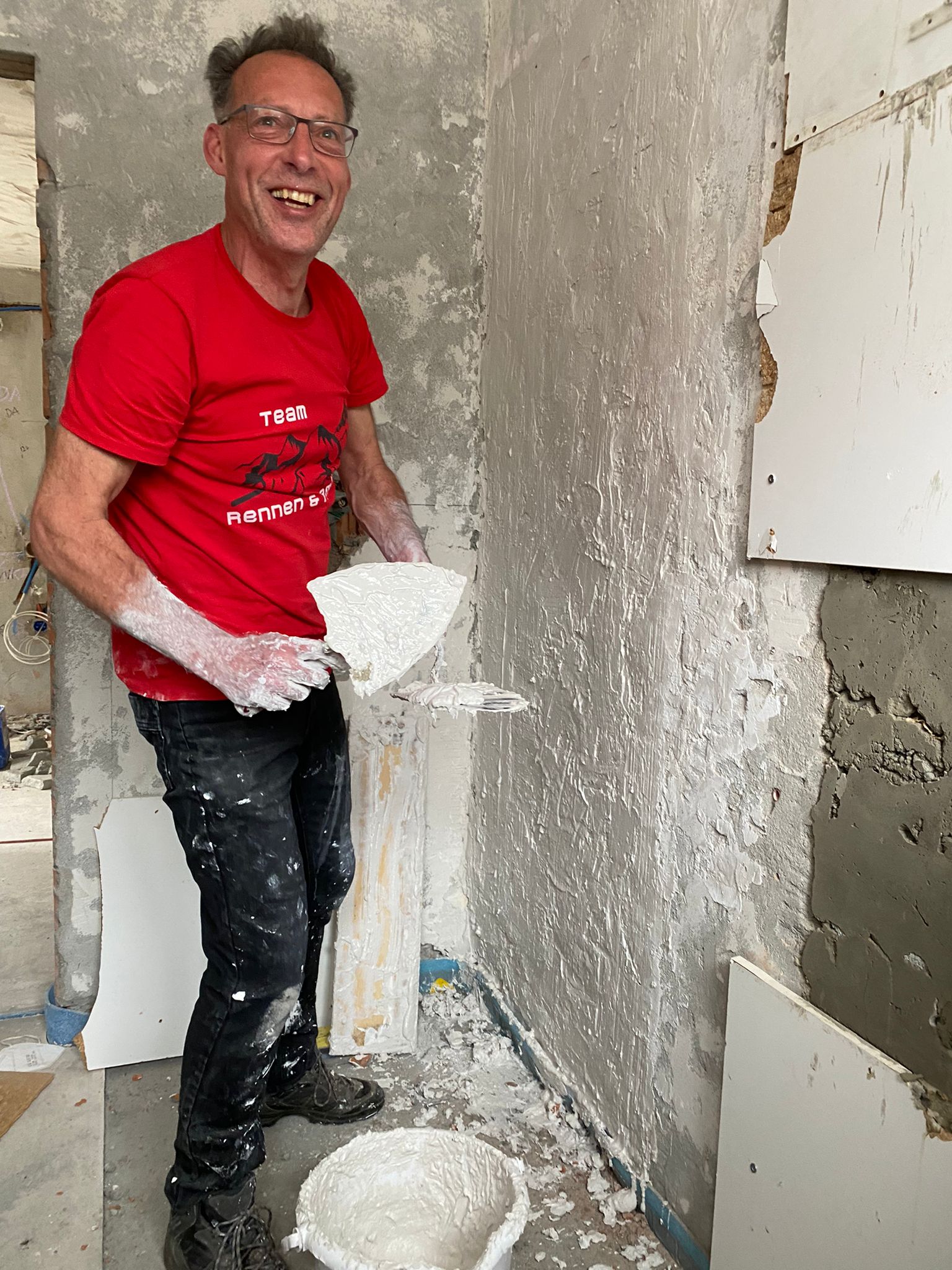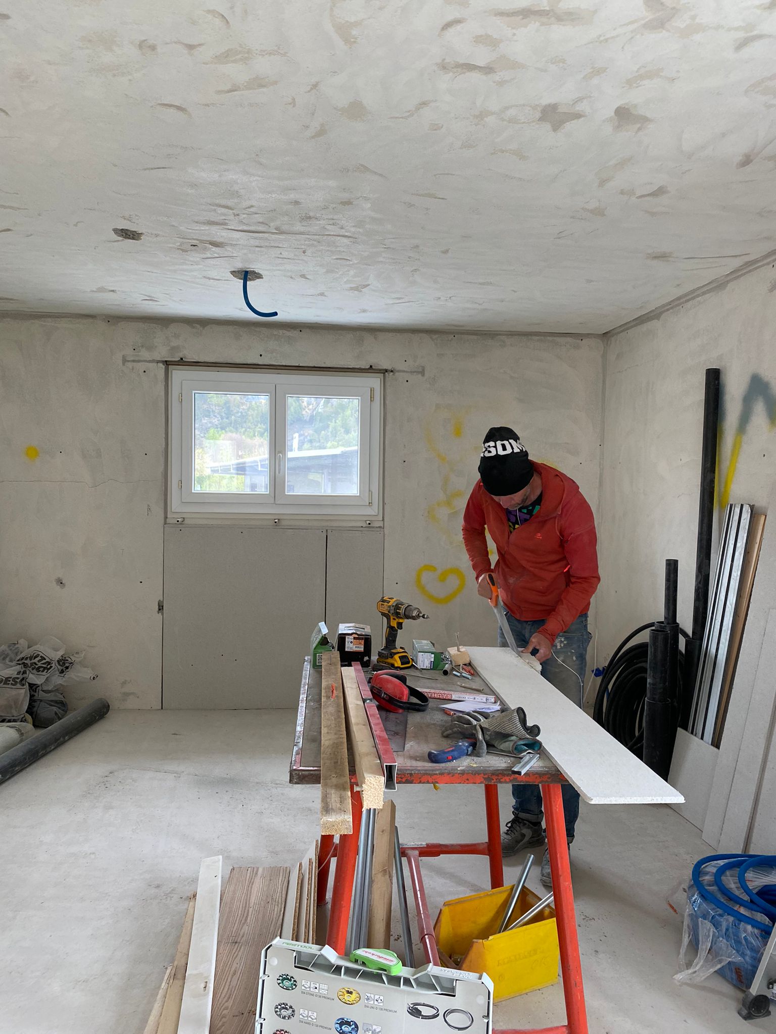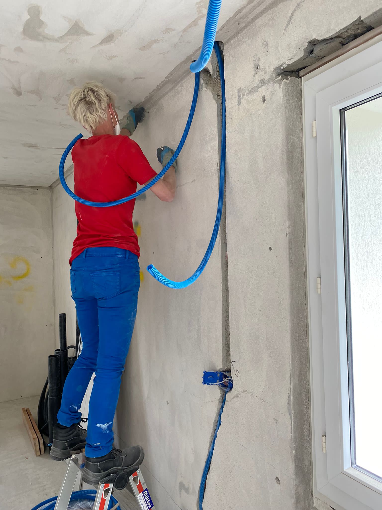 We gaan de kleine studio klaarmaken voor de stukadoor. Zwitserse stukadoors werken anders dan anderen. Ze zetten niet op met anderhalve centimeter maar met anderhalve milimeter. Een misrekening waardoor wij heel veel extra werk hebben in het egaliseren van muren, plafonds en alle gaten die we gemaakt hebben voor elektriciens en loodgieters.