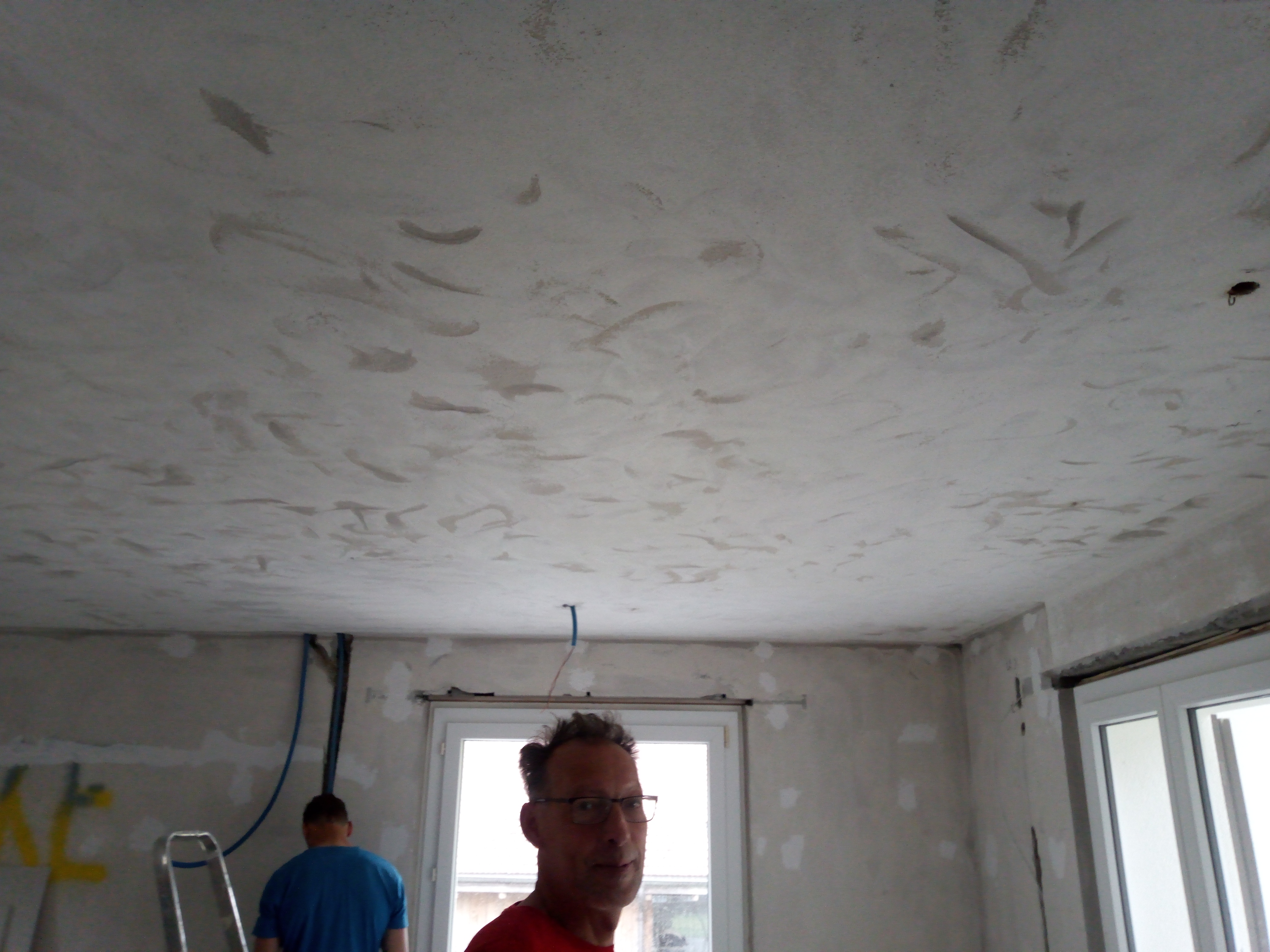 Even weer simpel dom werk doen. Ik maak een dikke emmer betonmortel aan en begin in een hoek met het afsmeren van het plafond. Er zitten halve manen in geëtst en gaten die onze Zwitserse stukadoor niet tot zijn takenpakketje rekent. Wij mogen ieder oneffenheid je voorstrijken en wegwerken en samen met Diana werk ik twee uren boven de macht om het halve plafond zo strak te maken als het oppervlak van een biljartbal.