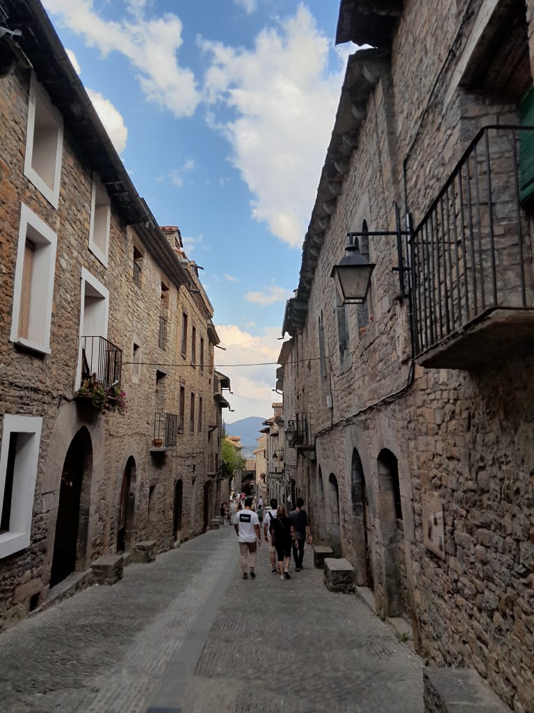 De rit gaat naar Ainsa, een van de oudste en mooist geconserveerde dorpjes van Spanje. Lou kent de weg van de berg af en rijdt als een malle die achtervolgd wordt door een psychopaat. Ik vlieg alle kanten uit in de terreinwagen en grijnzend kijkt ze achterom. Mij krijg je niet spugend, ze haalt wel alles uit de kast. Het Italiaanse ijs smaakt beter dan ik het ooit proefde in deze hitte en dromerig zitten we met zes in stilte te genieten.