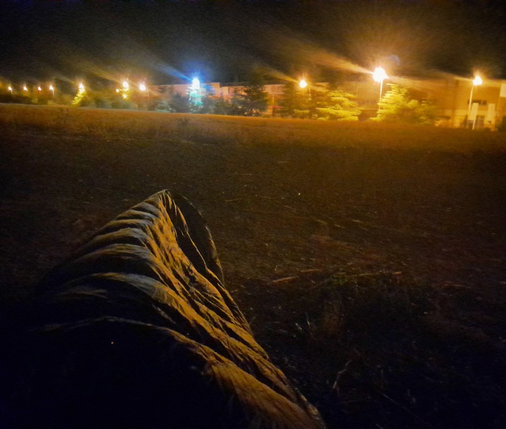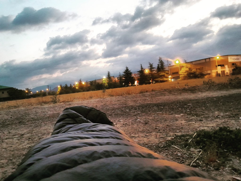 Ik laveer door een industrieterrein en vind een open veld met een lange muur aan een zijde met daarachter een groentetuin annex boomgaard. Ik loop weg van de weg en leg mijn slaapzak uit, met hoofdeinde tegen de muur. Een veilige plek waar niet snel iemand boven mijn hoofd zal staan. Ik val om 2.30 uur in slaap met Huesca aan mijn voeten. Een mat heb ik niet, zelfs geen isolatiedeken. Het is warm en droog genoeg hier.