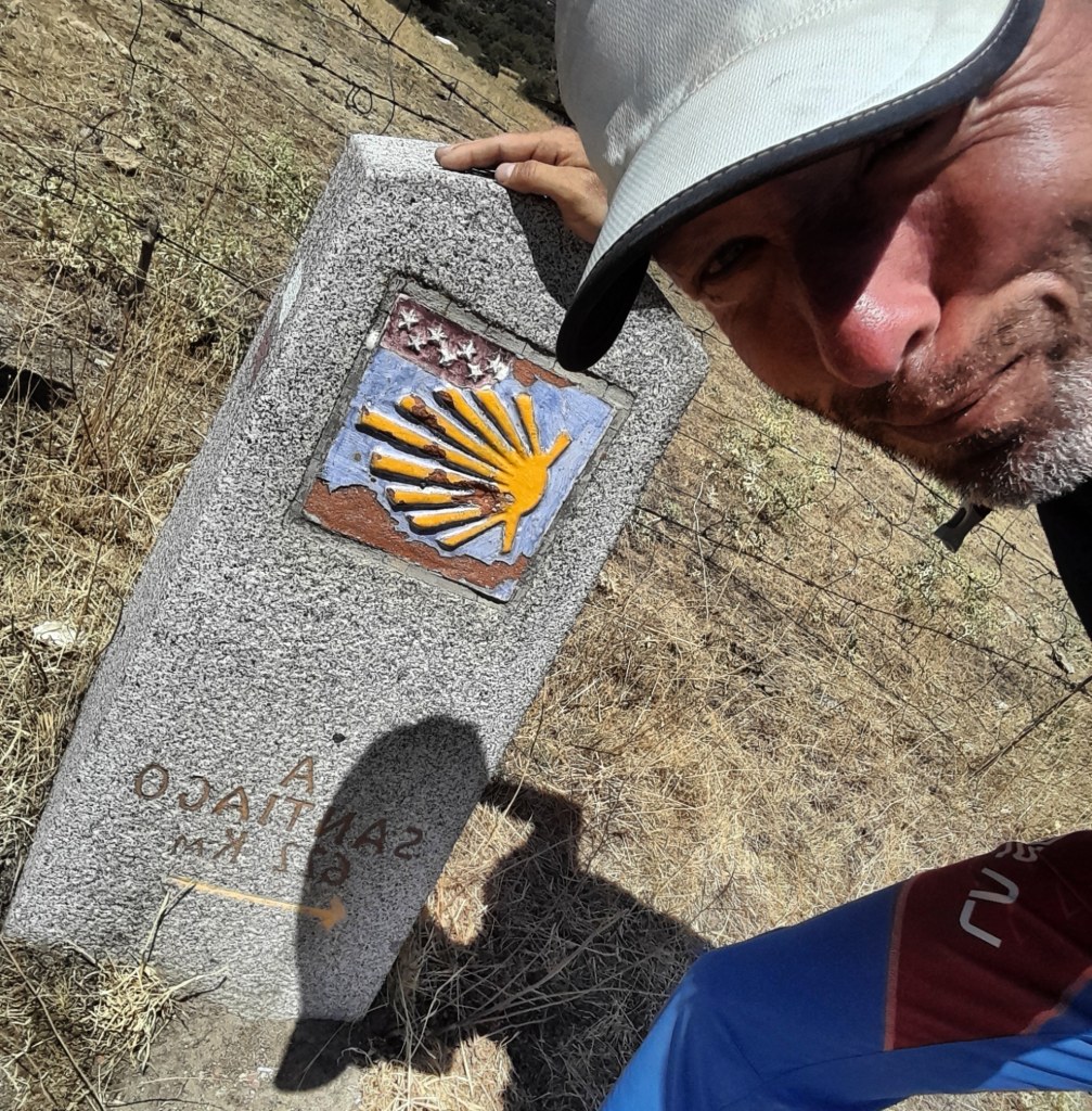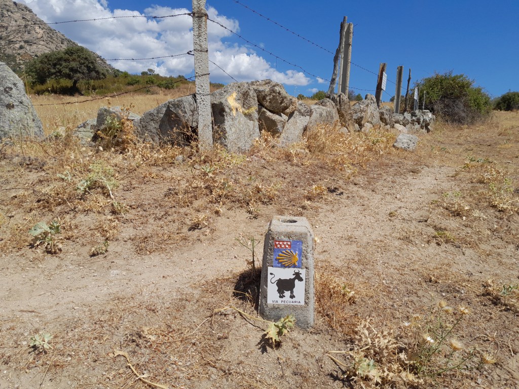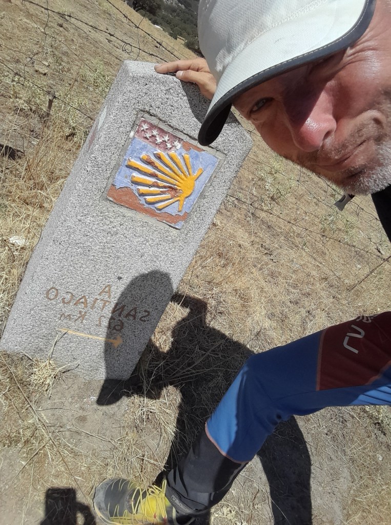 In Mantalpino voegen we de daad bij het woord met twee Tinto de Verano, zomerwijn aangelengd met van alles en fruit. Het drinkt weg als limonade en is zeer verfrissend. Meteen na het dorp een karrespoor met overal merktekens van de camino. Het is naar adem snakken en het gele zand weerkaatst een bak licht waar je blind van wordt.